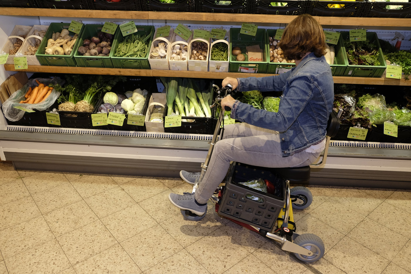 Durch Hochheben am Henkel entfaltet sich dieser Klappkorb von selbst und passt ohne jegliche Fixierung bequem unter dem Sitz in den Fußraum des TravelScoot ™, ohne die Bewegungsfreiheit zu mindern. An der Kasse kann der Korb einfach samt Inhalt auf das Förderband gestellt werden und nach der Bezahlung wieder zurück auf den TravelScoot ™ gehoben werden. In vielen Fällen können Sie so auf die zunehmend kostenpflichtigen Plastik- oder Papiertüten verzichten und leisten damit auch einen wertvollen Beitrag für die Umwelt!