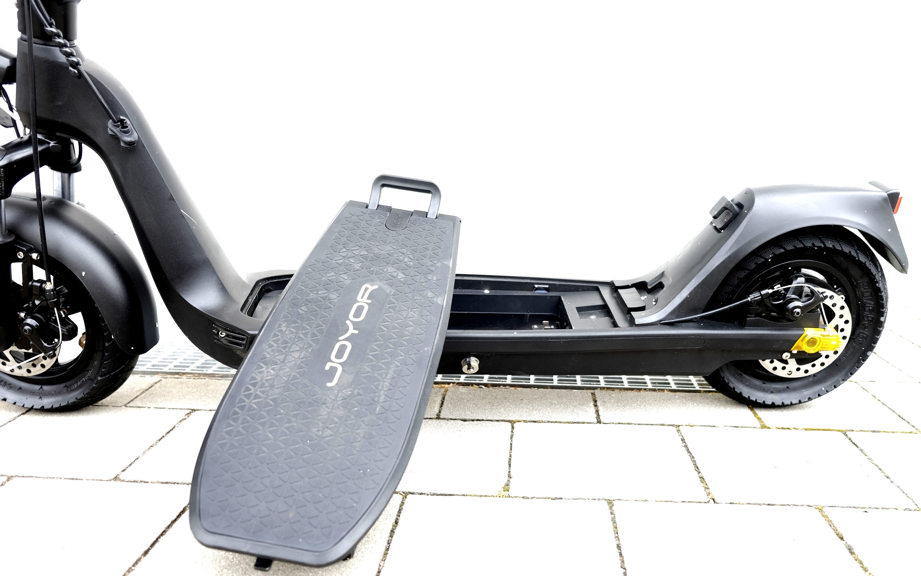 Der Joyor C10E ist mit einem großen, gut ablesbaren Display ausgestattet, das wichtige Informationen wie Geschwindigkeit und Akkustand anzeigt. Die Batterie ist herausnehmbar, sodass sie bequem zu Hause oder im Büro geladen werden kann. Mit einem einfachen Ein-Knopf-Faltsystem lässt sich der Scooter mühelos zusammenklappen und verstauen, was ihn besonders praktisch für den Transport macht.