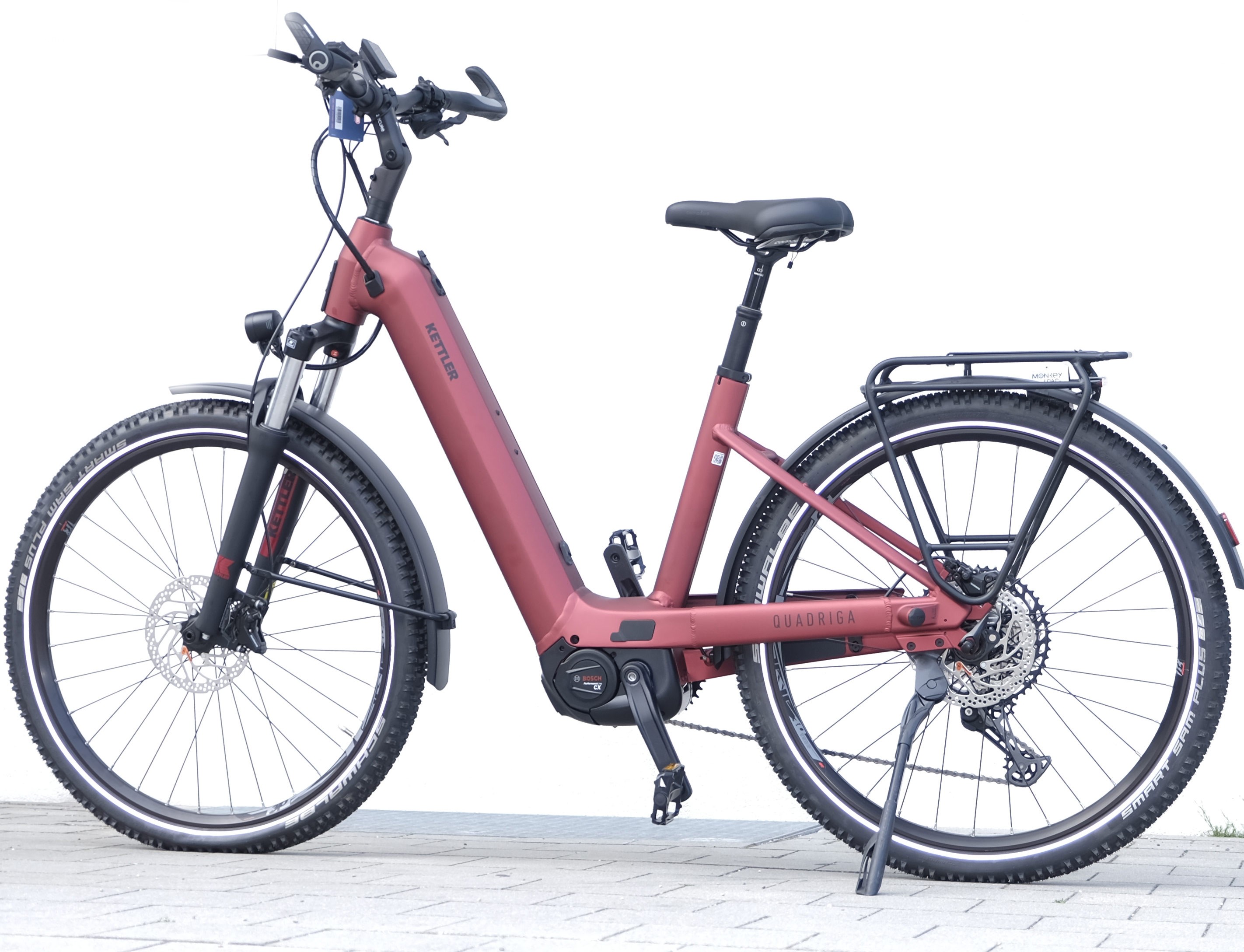 Griffige Reifen, 100 mm Federweg vorne sowie eine gefederte und zugleich absenkbare Sattelstütze (Eurobike Award Gewinner 2019) machen das QUADRIGA TOWN & COUNTRY COMP 750 ideal für Touren und Alltagsfahrten über schlechte Wege und auf unbefestigtem Terrain. Ausgestattet mit dem neuen smarten System von Bosch - bestehend aus E-Bike Flow App, Bedieneinheit, Display, Akku und Antrieb - ist das E-Bike vollvernetzt. Der drehmomentstarke Bosch Performance Line BES3 CX Motor sorgt für kräftigen Schub, wobei der integrierte 750 Wh Akku große Reichweiten ermöglicht. Über das tastenlose Kiox 300 Farbdisplay, steuerbar über die LED Remote, lassen sich alle relevanten Fitnessdaten anzeigen. Darüber hinaus ist es über die LED Remote mit der E-Bike Flow App verbunden. Mit der App lassen sich Fahrmodi individuell anpassen, Aktivitäten aufzeichnen und Fitness-Apps einbinden. Mit 12-Gang Kettenschaltung kann auch an steilen Anstiegen locker pedaliert werden. Der MonkeyLoad Systemgepäckträger, der extrem helle 100 Lux Strahler sowie die Möglichkeit der einfachen Montage eines Kinderanhängers per K-Link-Adapter sorgen für maximale Alltagstauglichkeit.