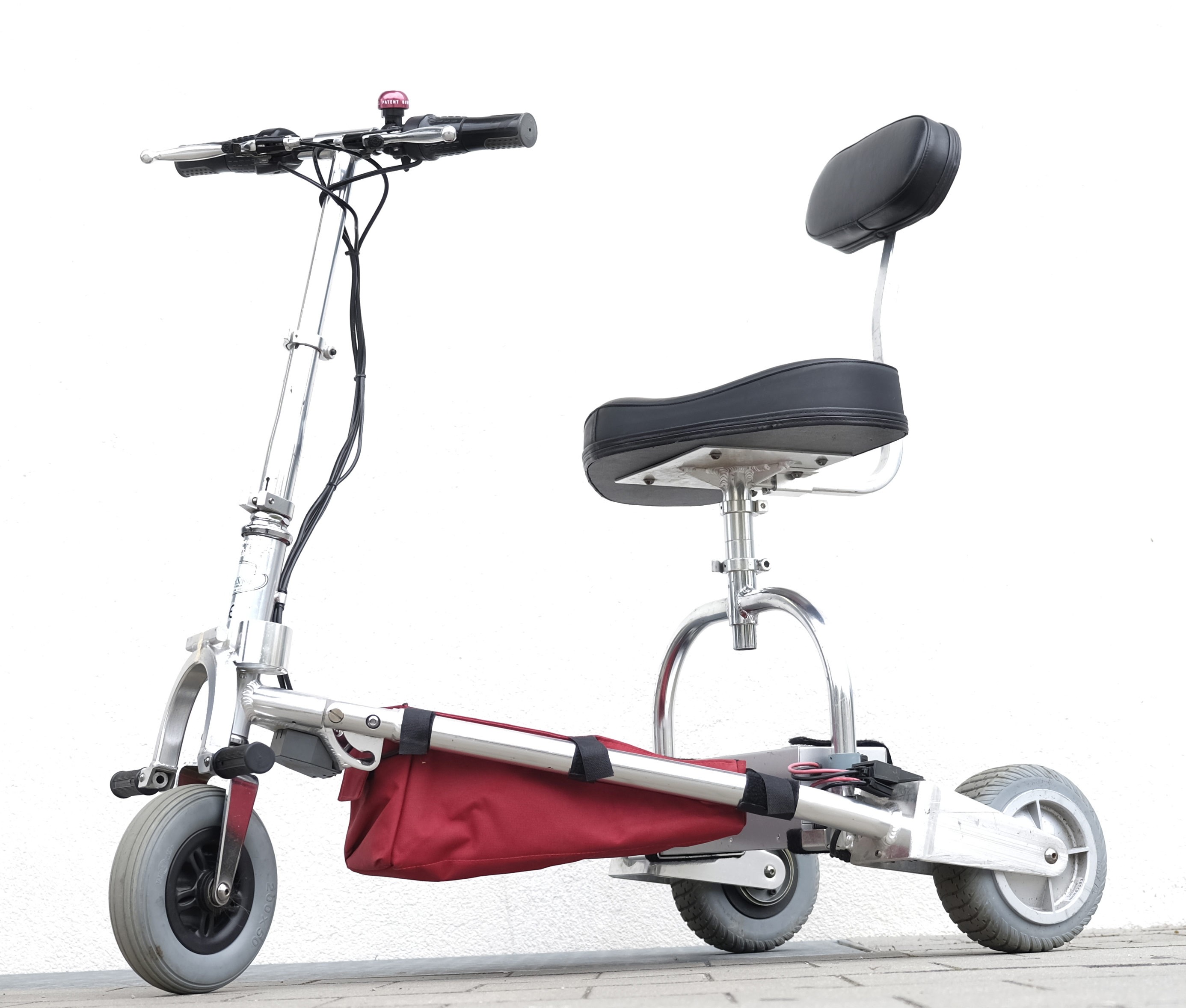 Leichtbaumobilitaetshilfe zusammenklappbare einzigartige beliebte Bauart mit 6 km/h nutzbar auch auf Gehwegen. Extrem leichter Reisebegleiter auf drei Rädern fuer geh- und kreislaufeingeschränkte Personen, pannensicheren Polyurethanreifen.