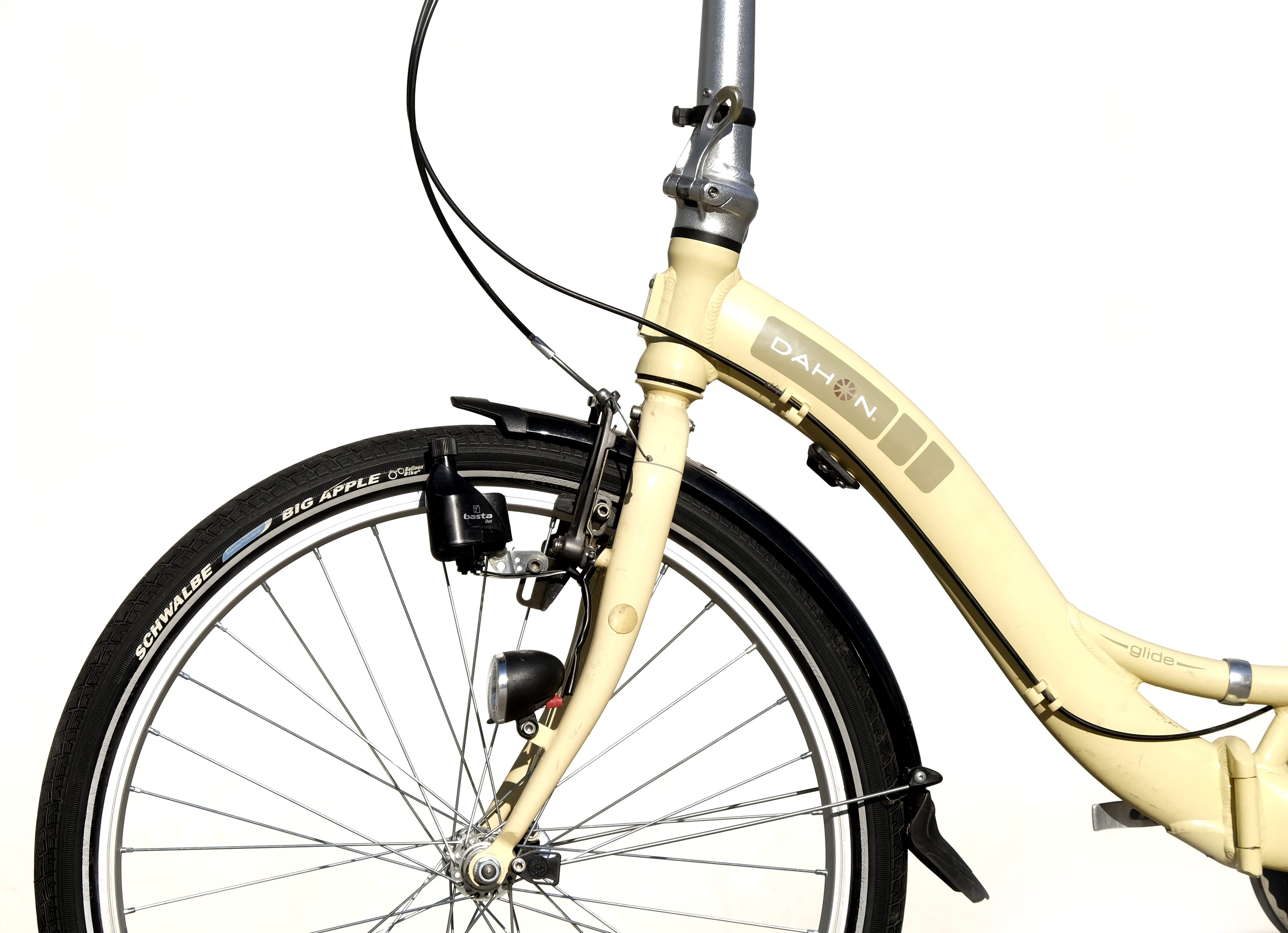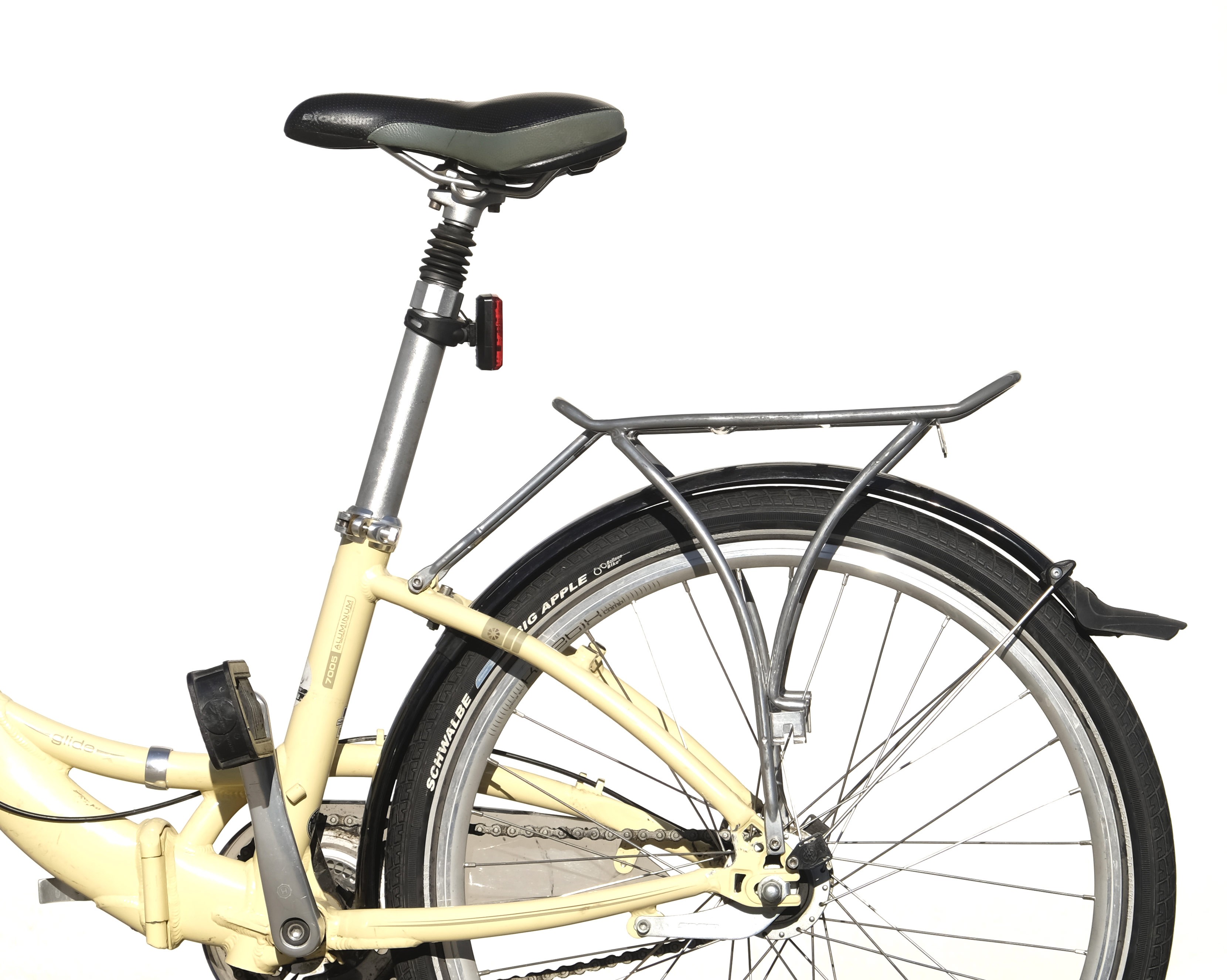 Foldable 24 inch bike with Schwalbe Big Apple tires, two-legged kickstand, saddle suspension, 7-speed hub gears, luggage rack, folding pedals, LED light via side dynamo.
