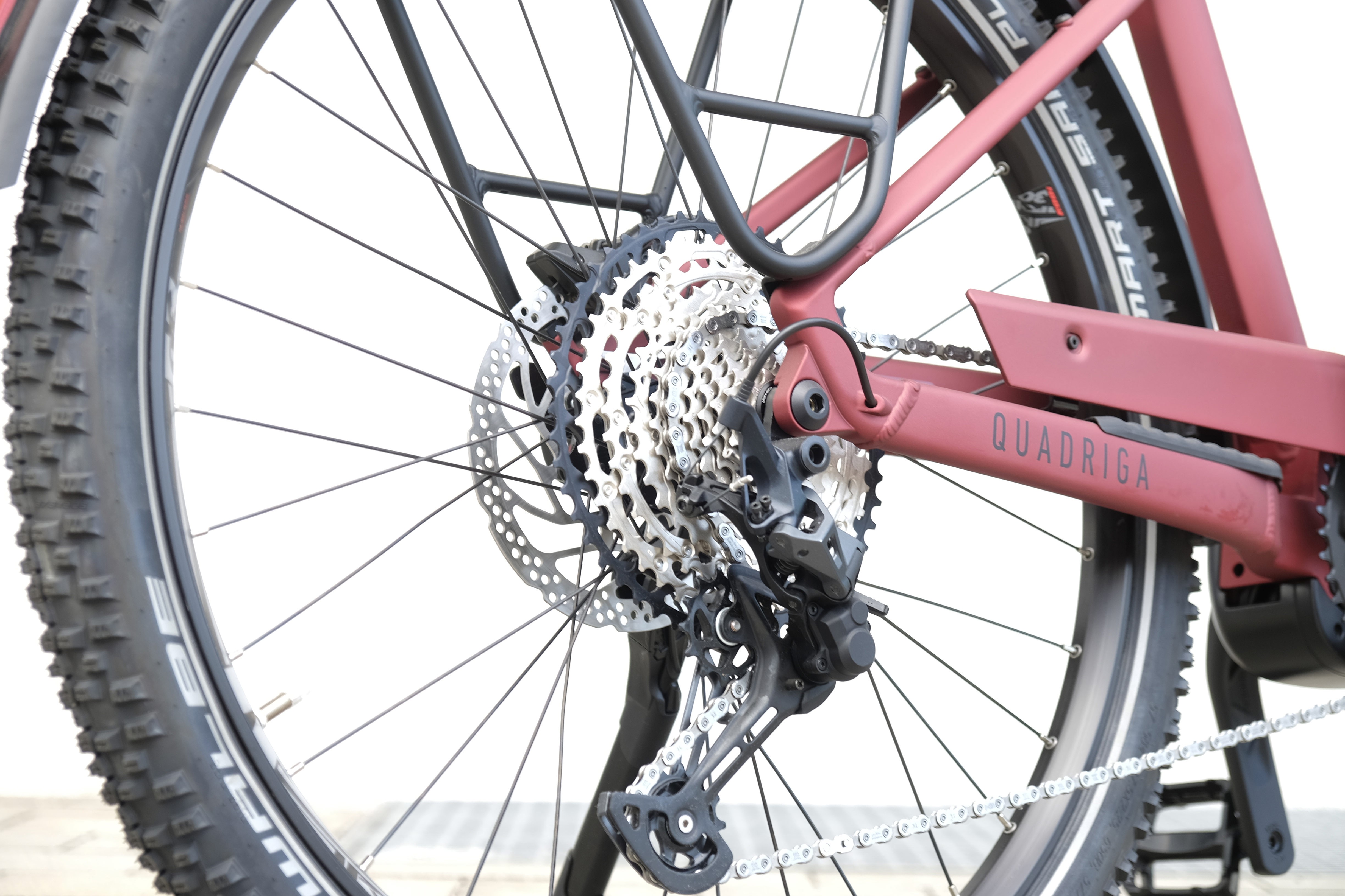 Grippy tyres, 100 mm front suspension travel and a suspended and lowerable seat post (Eurobike Award winner 2019) make the QUADRIGA TOWN & COUNTRY COMP 750 ideal for touring and everyday rides on poor paths and unpaved terrain Equipped with the new smart system from Bosch - consisting of the E-Bike Flow app, control unit, display, battery and drive unit - the e-bike is fully networked. The high-torque Bosch Performance Line BES3 CX motor provides a powerful boost, while the integrated 750 Wh battery enables long ranges. All relevant fitness data can be displayed on the keyless Kiox 300 colour display, which can be controlled via the LED Remote. It is also connected to the E-Bike Flow app via the LED Remote. The app can be used to customise riding modes, record activities and integrate fitness apps. With 12-speed derailleur gears, pedalling is easy even on steep climbs. The MonkeyLoad system luggage carrier, the extremely bright 100 lux spotlight and the option of easily attaching a child trailer using the K-Link adapter ensure maximum suitability for everyday use.