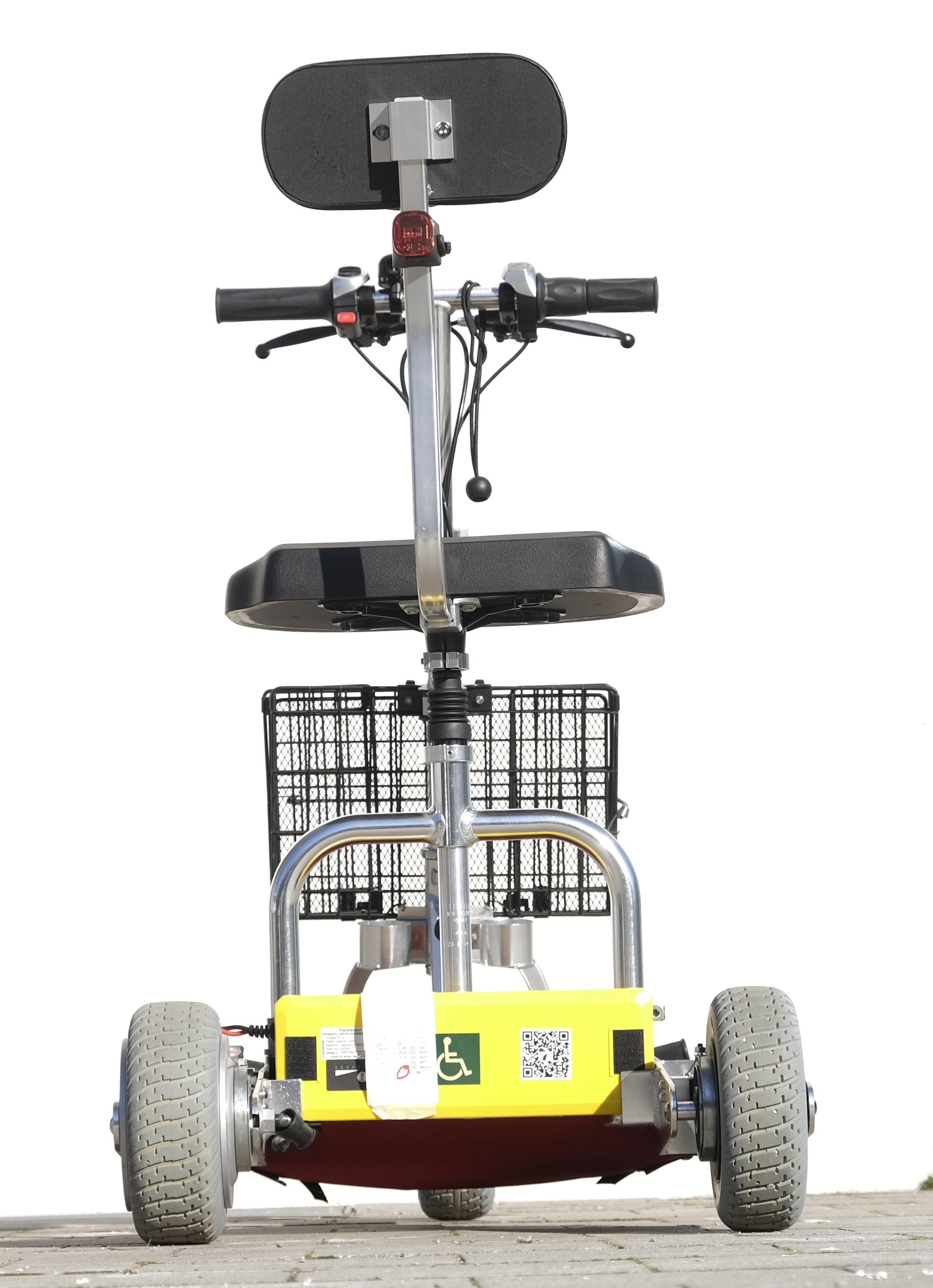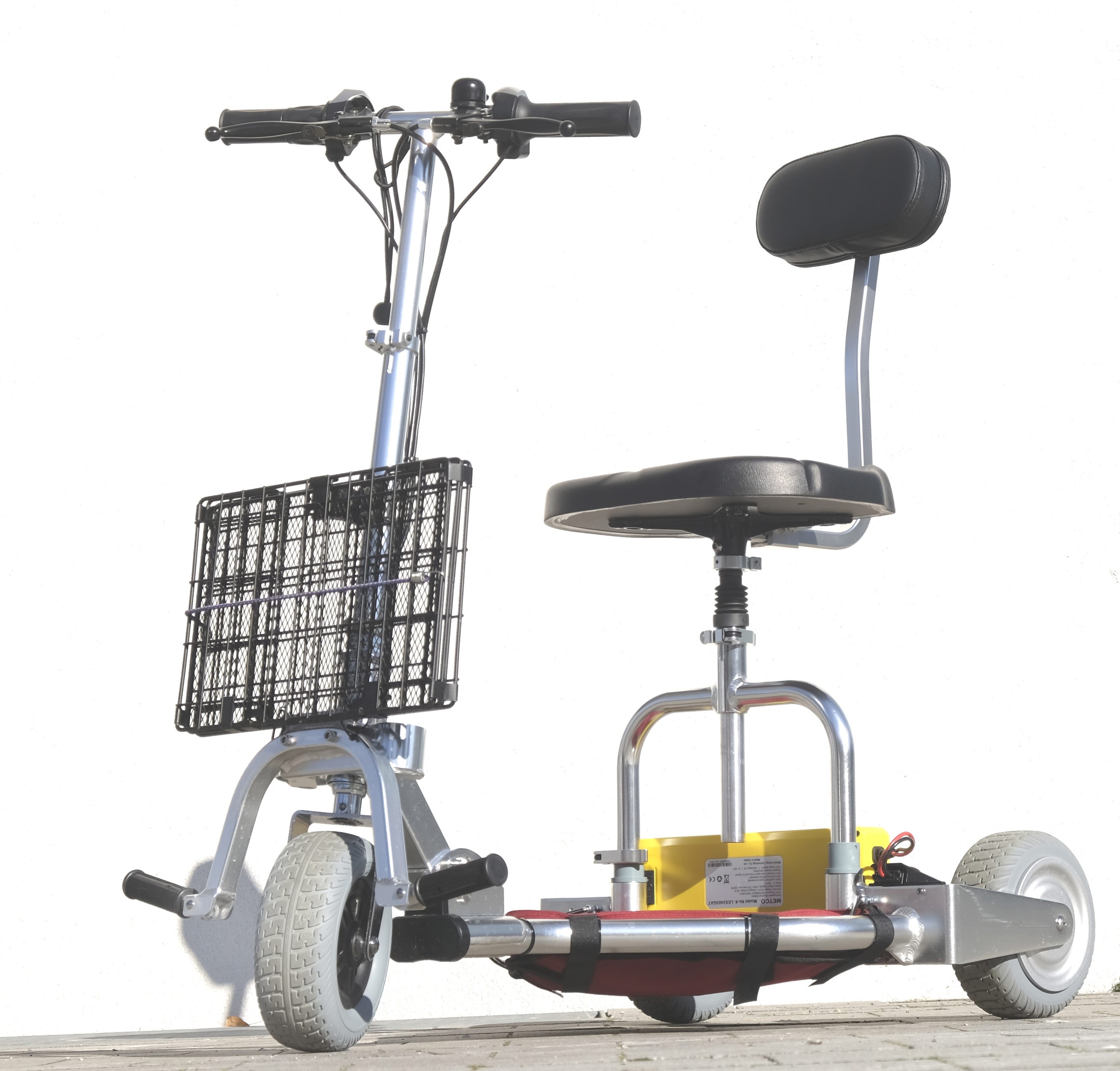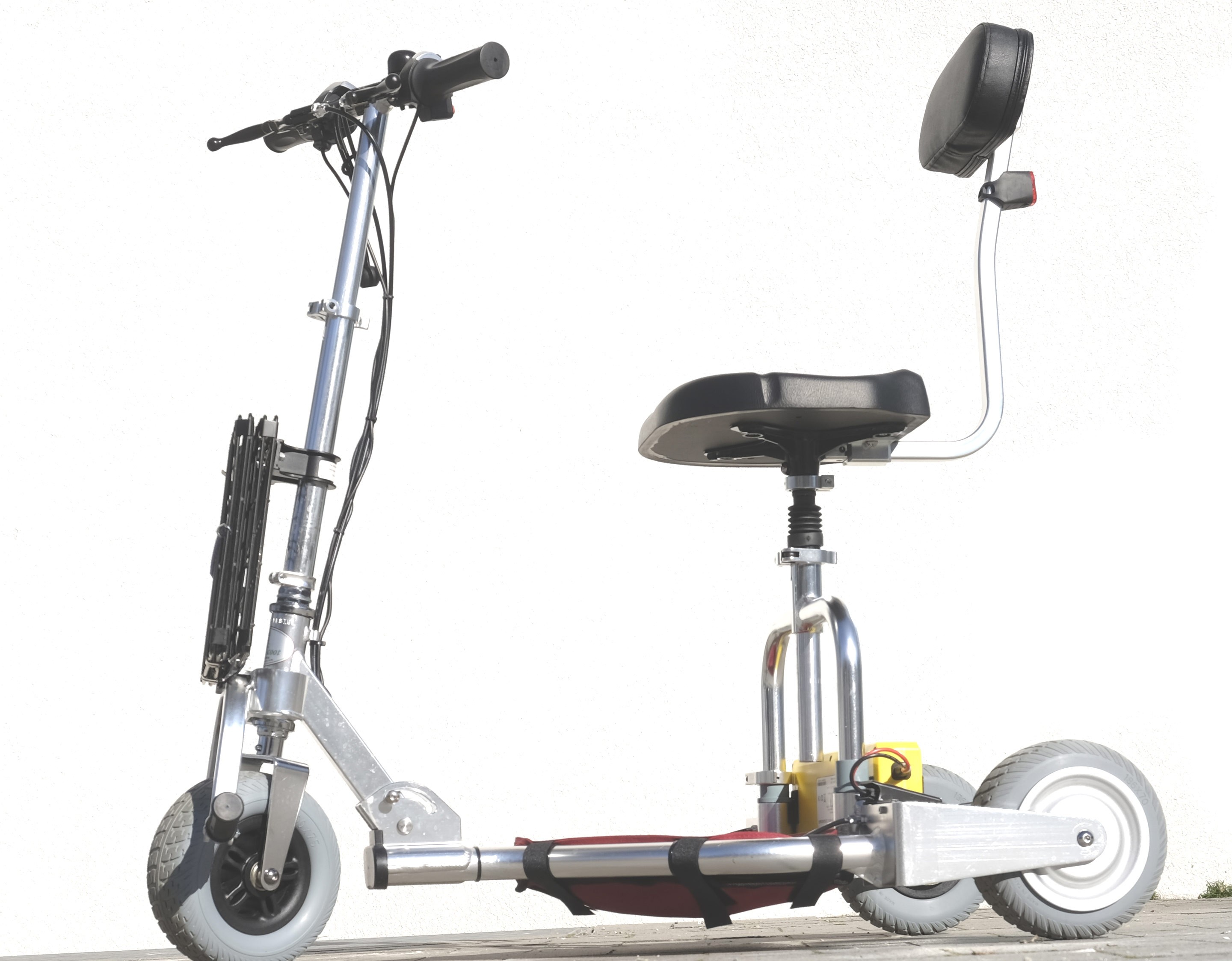 The TravelScoot Escape is a technical mobility aid with low entry, extremely compact dimensions of 72 x 54 x 27 cm when folded and a sensationally light frame weight of 9.4 kg (frame with handlebars, motor, brakes, rear wheels, steering column, etc.).) and powerful hub motor (24V DC 200W), reverse modes and band brake, incl. wide front wheel with plug-in fork (1.2 kg), seat with seat tube and seat plate (1.3 kg) with backrest and backrest cushion (0.5 kg) on U-bracket (0.4 kg), detachable footrest with walking stick holder. Footrest at a height of 13.5 cm (footrest can be moved forward using extended footrest holder accessory). Handlebar width 41 cm, lowest ground clearance 6 cm. Handlebar and seat height-adjustable, seat can be adjusted forwards and backwards with accessories (U-bracket version, reversible bracket as optional accessory) for tall and short people. Seat height 47 - 55 cm.