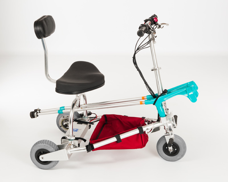 The new TravelScoot frame Escape technical mobility aid now with low entry and extremely compact dimensions of 72 x 54 x 27 cm when folded with an incredibly light frame weight of 9.4 kg (frame with handlebars, motor, brakes, rear wheels, steering column etc.) with powerful hub motor.) with powerful hub motor (24V DC 200W), reverse modes and band brake, wide front wheel with plug-in fork (1.2 kg), seat with seat tube and seat plate (1.3 kg) with backrest and backrest cushion (0.5 kg) on U-bracket (0.4 kg), removable footrests with walking stick quiver. Footrest height 13.5 cm (footrest can be extended to the front using the extended footrest mounting block accessory). Handlebar width 41 cm, lowest ground clearance 6 cm. Height-adjustable handlebar. Height-adjustable seat, seat can be moved forwards and backwards with accessories (U-bracket version, reversible bracket as optional accessory) for short and tall people.