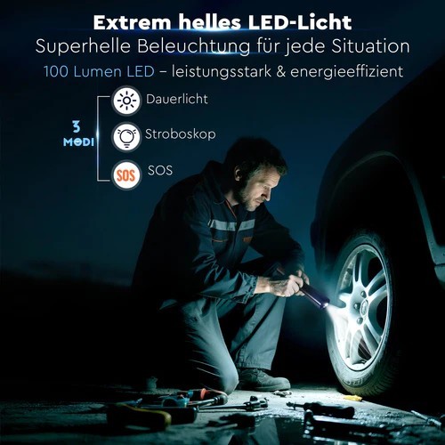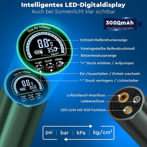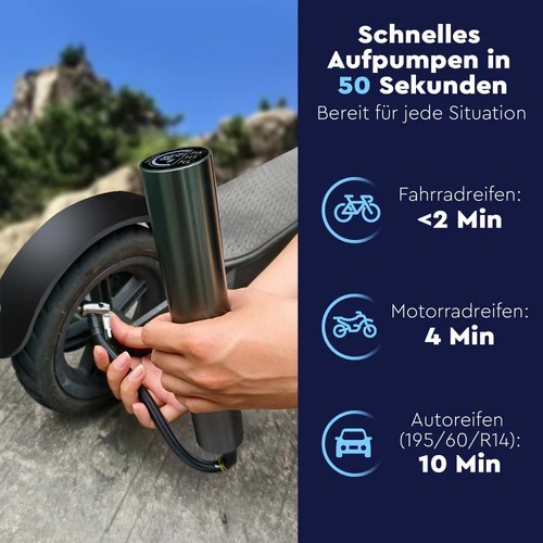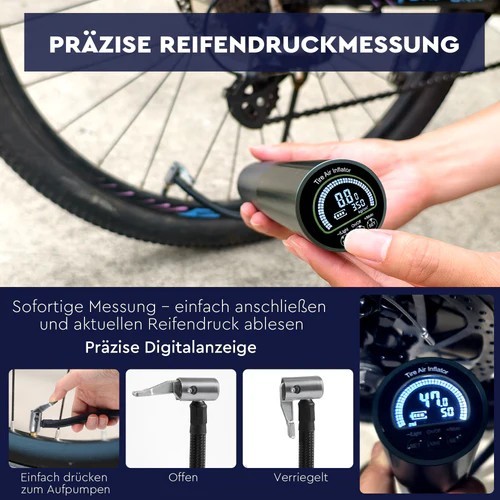 The high-quality air compressor pump is perfect for inflating car and bicycle tyres as well as sports equipment. Thanks to its compact design and powerful rechargeable battery, it is an indispensable companion when travelling!