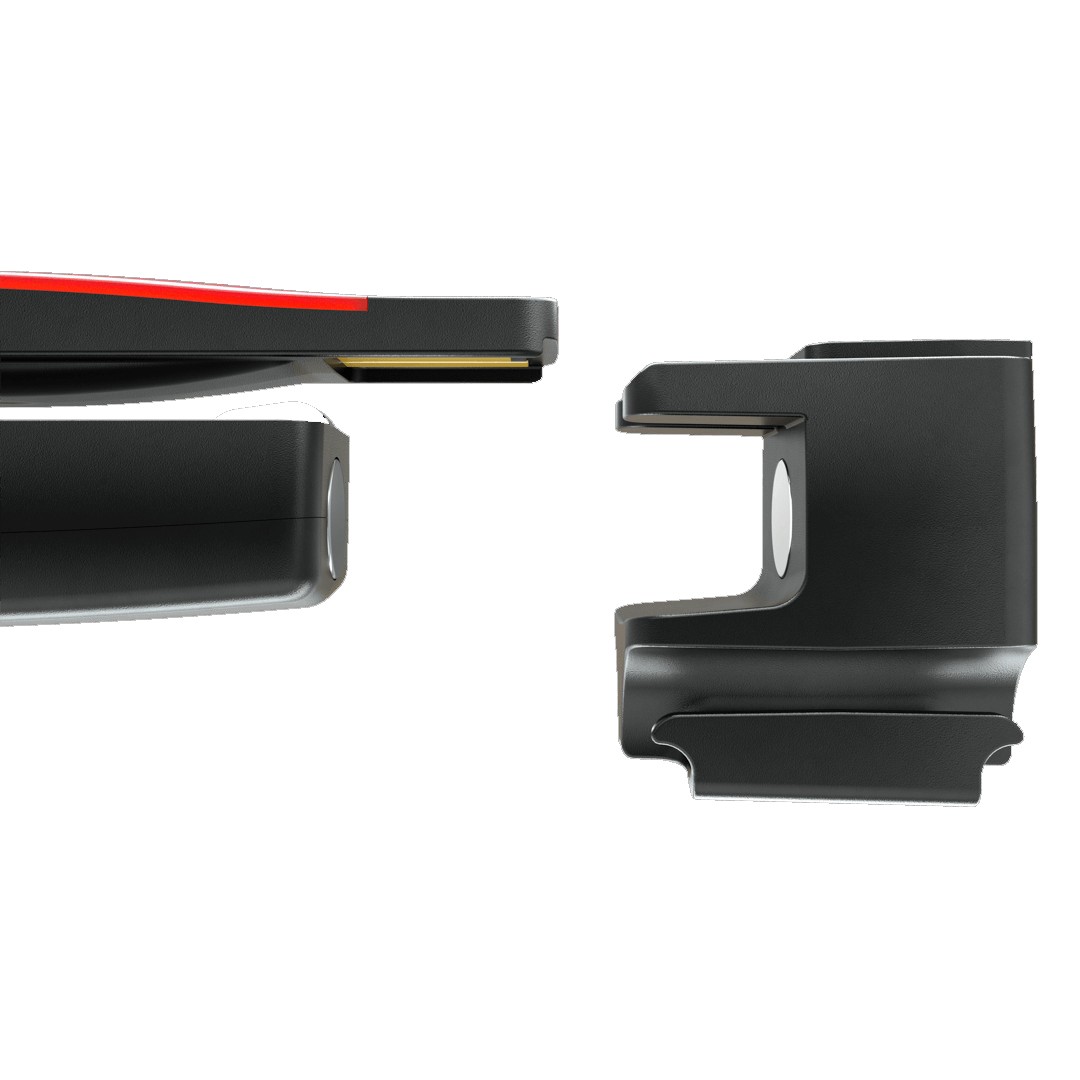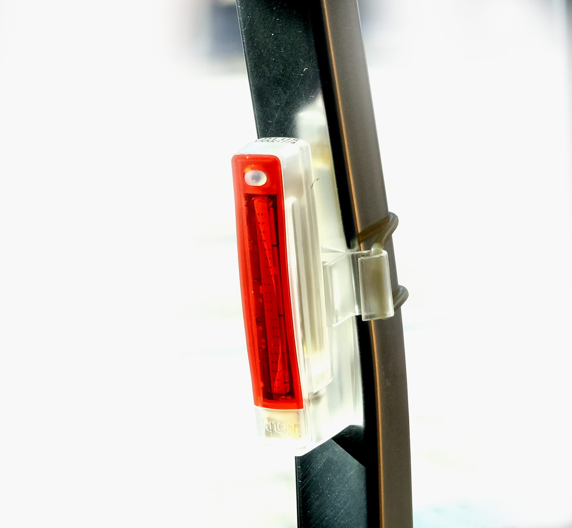 Forme et fonction similaires à celles d'un trombone (plus grand). En conséquence, le support en velcro siliconé à l'intérieur pour tige de selle ou bâtons de marche nordique possède un aimant puissant qui maintient la lampe en place en toute sécurité. En dehors du support, Plus peut être fixé à l'aide d'un clip sur des vêtements ou des sacs et être ainsi utilisé par exemple pour la course à pied ou en plein air.