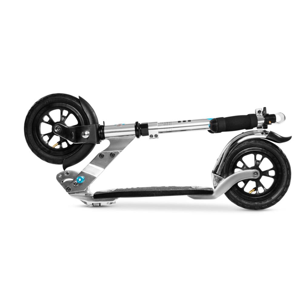 Le micro Scooter flex air est la révolution parmi les trottinettes. Avec ses pneus gonflables de 200 mm, c'est le premier scooter à pneus gonflables de la maison Micro Mobility Systems. Elle a été spécialement conçue et développée pour répondre aux besoins des utilisateurs de trottinettes adultes. Les pneus à air combinés au plateau flexible en fibre de verre breveté assurent une conduite particulièrement agréable, même sur des surfaces inégales. Grâce à ses pneus pneumatiques de 200 mm, la trottinette absorbe les irrégularités telles que les nids de poule, les joints, etc., de sorte que rien ne s'oppose à une conduite confortable. Grâce à son mécanisme de pliage et de fermeture à triple sécurité, elle garantit une sécurité maximale tout en étant facile et rapide à plier. Le scooter flex air est donc le compagnon idéal pour se rendre au travail, à une réunion ou tout simplement en ville. Le scooter flex air est équipé de série d'une protection contre les éclaboussures à l'avant et d'une béquille intégrée pour garer le scooter. La surface de marche d'environ 33 x 13,5 cm convient également aux chaussures de grande taille.