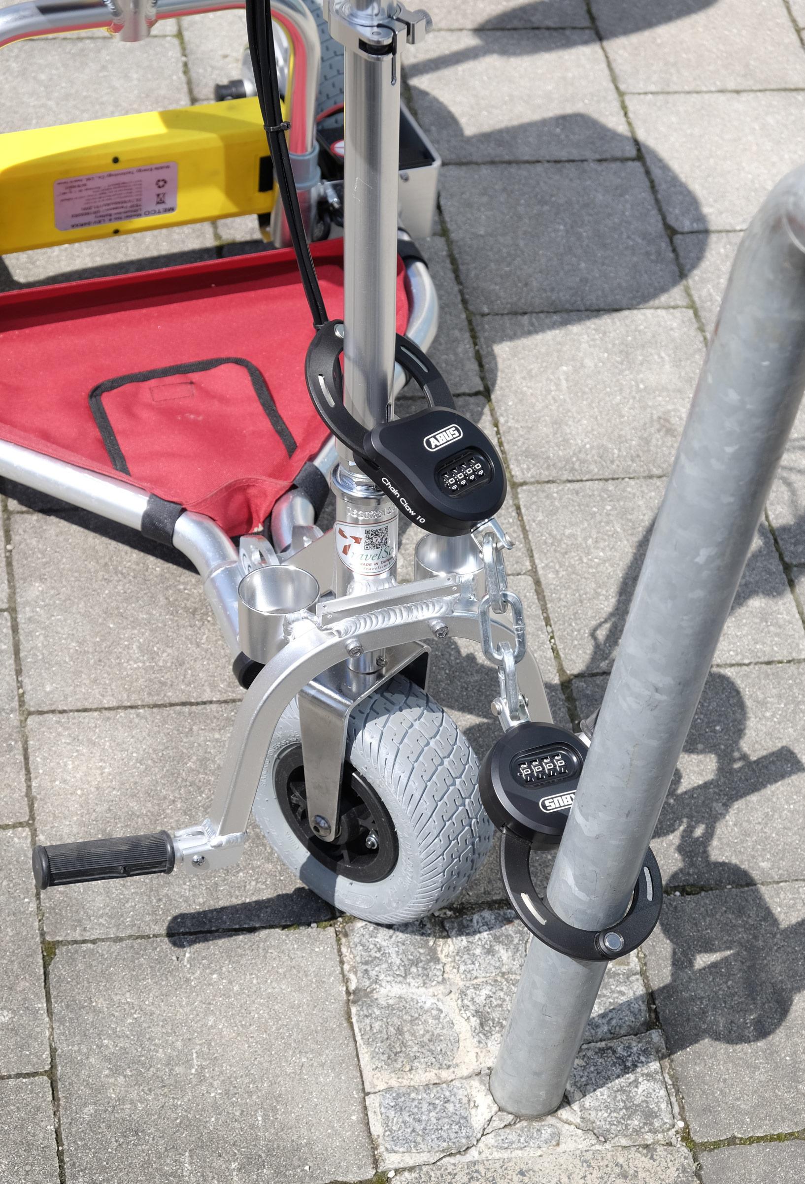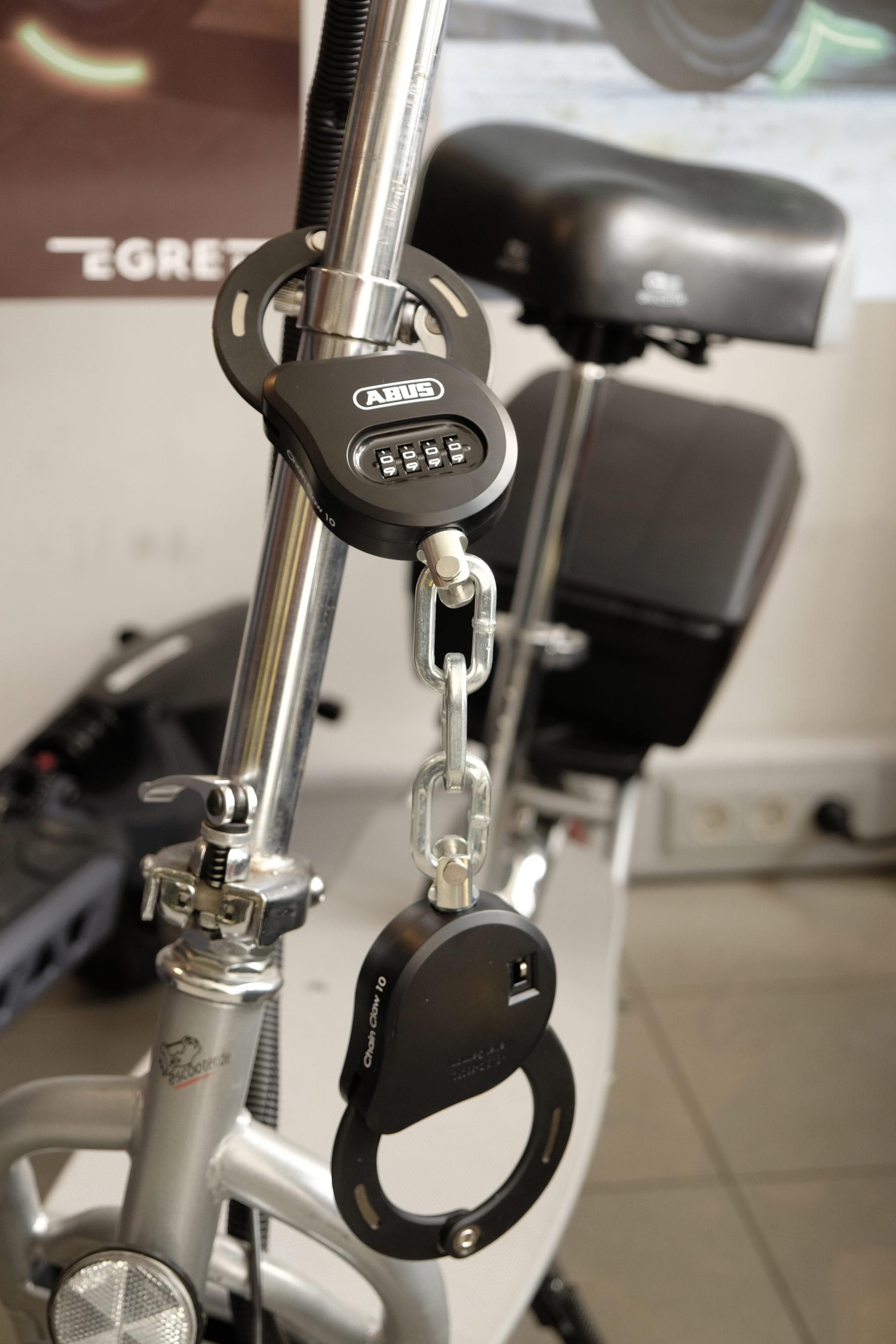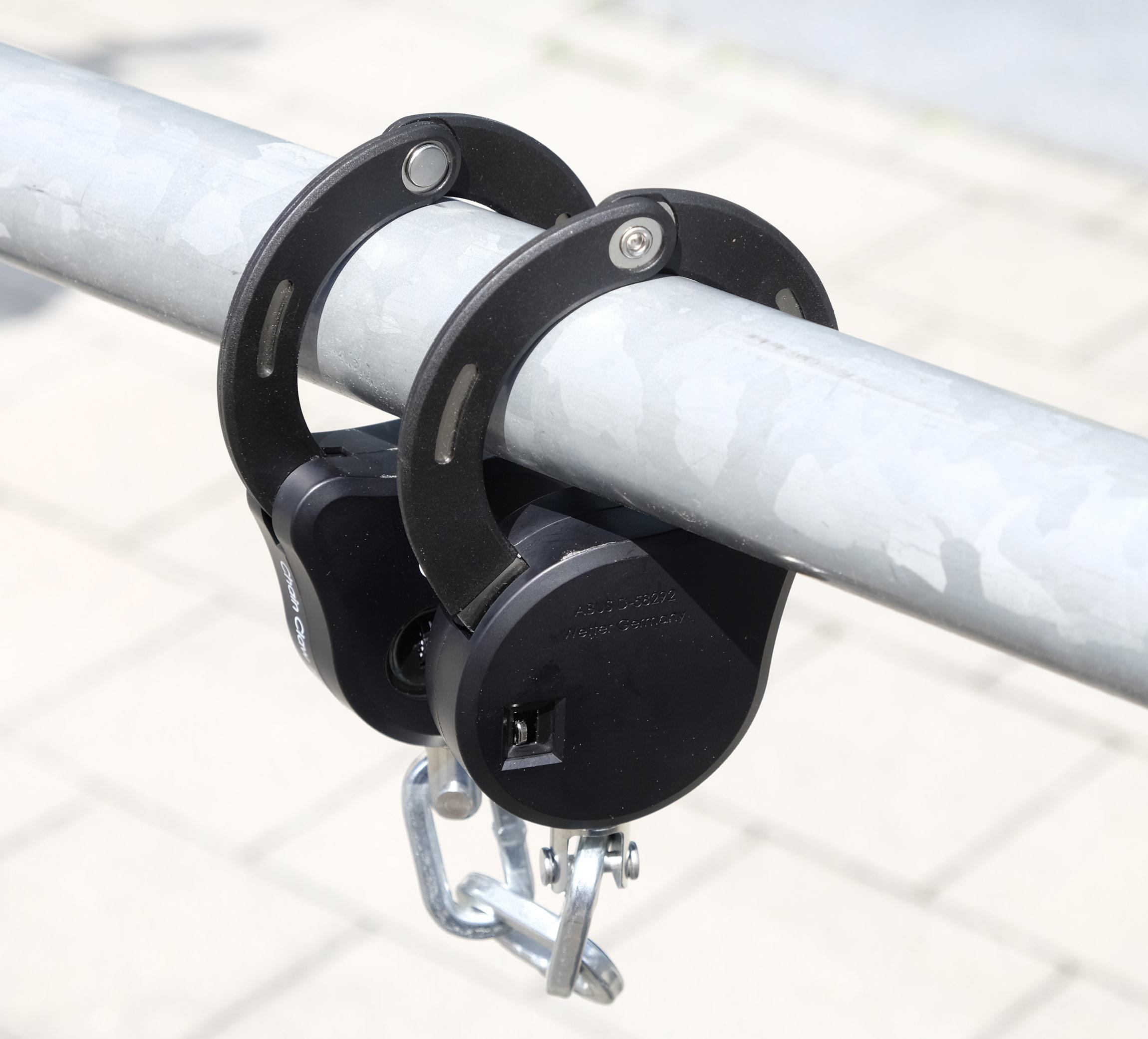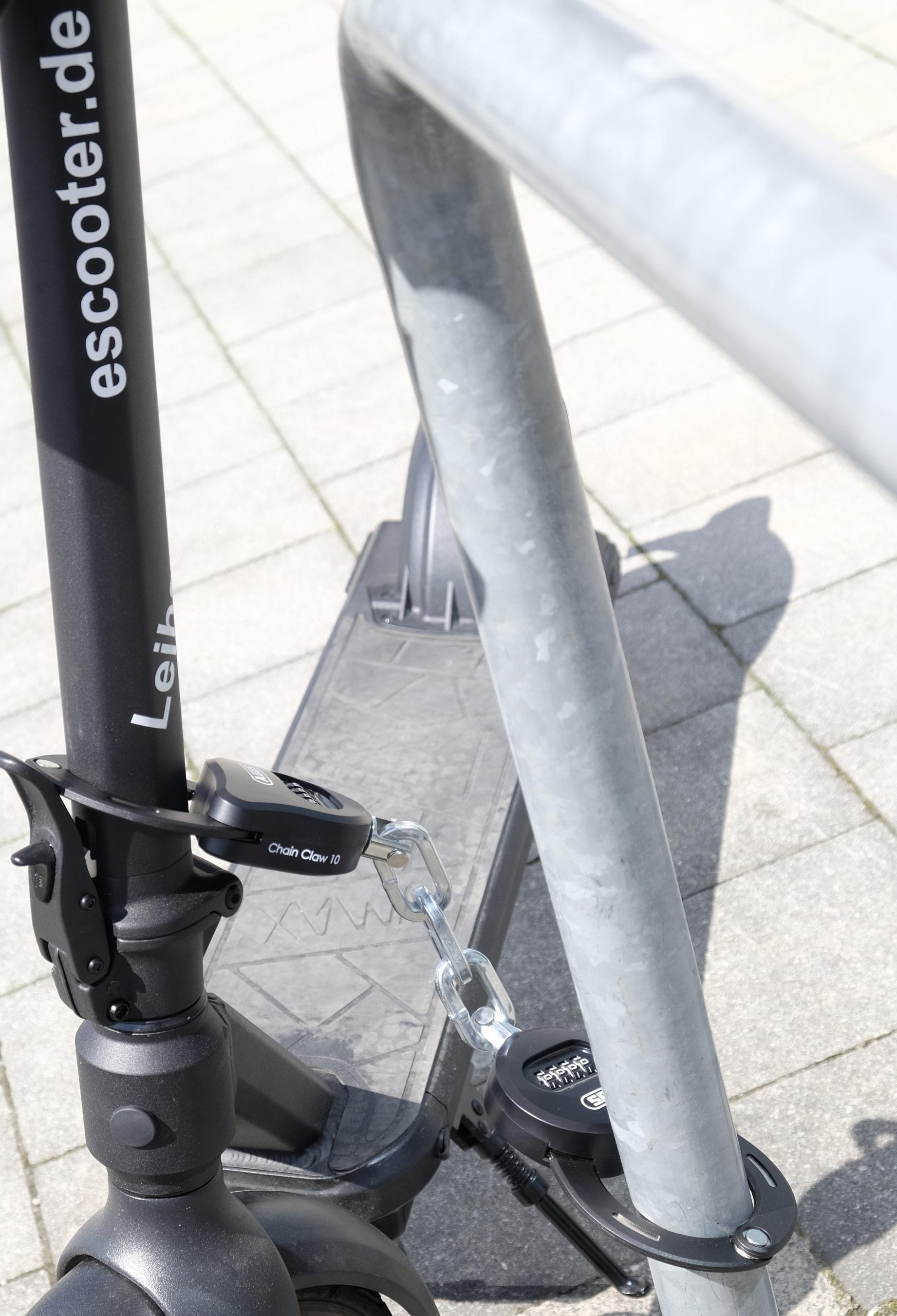 Les deux colliers qui peuvent être fixés séparément sont un grand avantage de l'antivol à menottes Chain Claw 10. C'est pourquoi l'antivol est surtout adapté à la sécurisation des scooters électriques. Mais il est également utilisé pour les vélos.