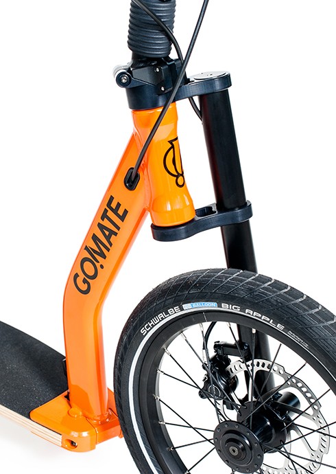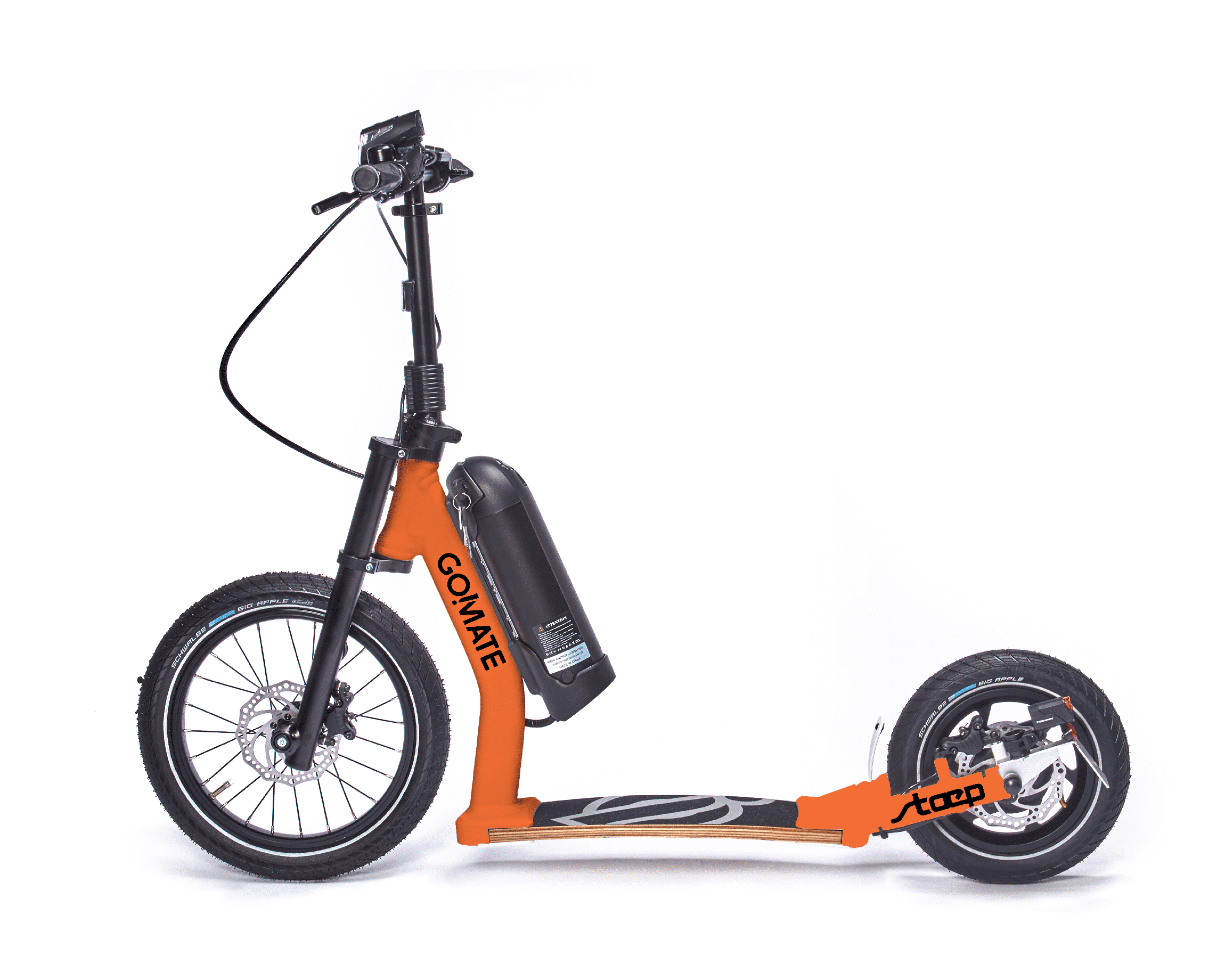 Streetsurfer auf Basis des Sportrollers TR1 mit mehrschichtigem Trittbrett, einseitiger Gabel mit 16“ Vorderrad, eine V-Gabel hinten mit 350W E-Motor im 12“ Hinterrad. Die überragende Federung resultiert aus der Kombination von Trittbrett und Luftbereifung und sorgt für das unvergleichliche go!mate Fahrgefühl. Der Lenker lässt sich für den Transport abklappen. Der Roller verfügt über eine Scheibenbremsanlage und ist ganz Made in Germany – ein edler Roller von Qualität.