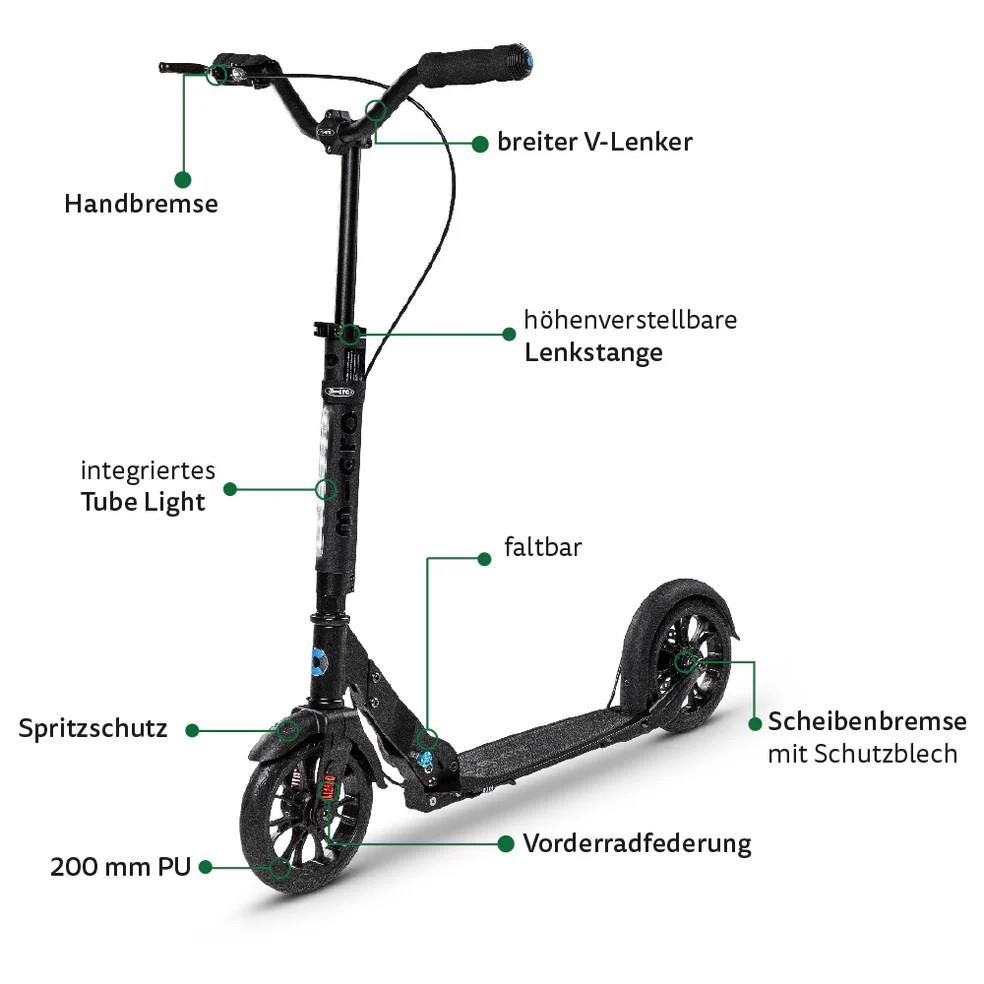 Was wenn ein Kickscooter eine Scheibenbremse, Zweibeinfederung vorne und Hinterradschwingenfederung und LED Beleuchtung hätte; - dann wäre es perfekt für den Urban Jungle!
