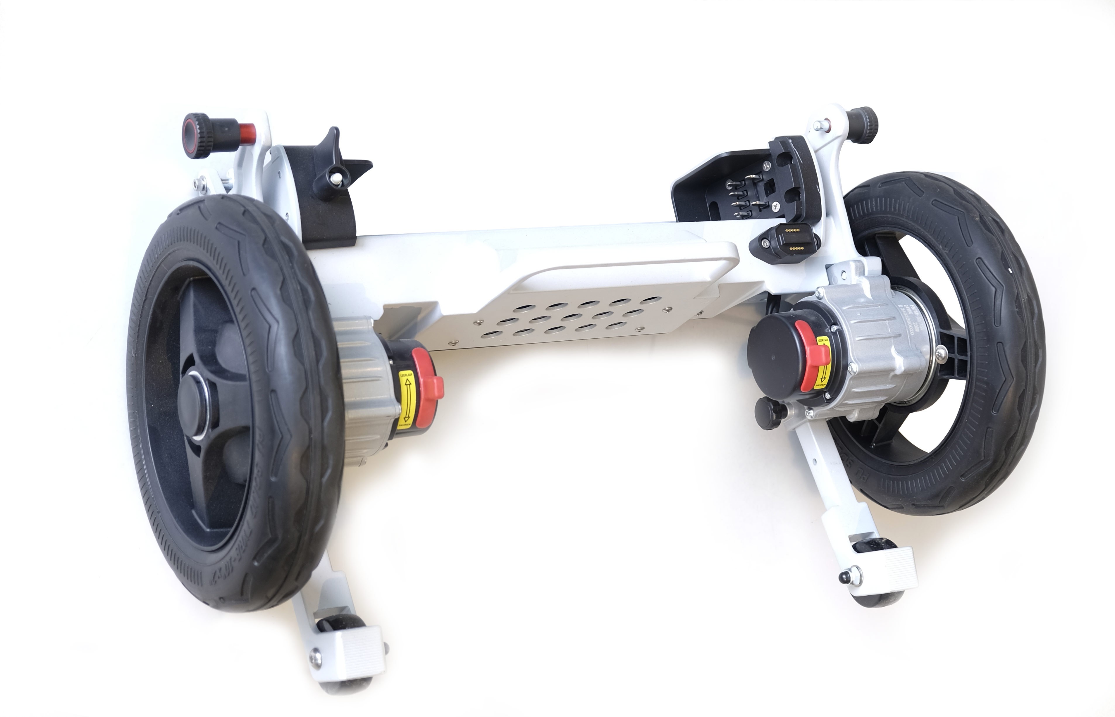 The front wheel of the Ultra Light has a diameter of 17 cm and the rear wheels 25 cm. All PU tyres. The chassis of the wheelchair is unsprung; however, the taut chair cover absorbs some of the shaking.