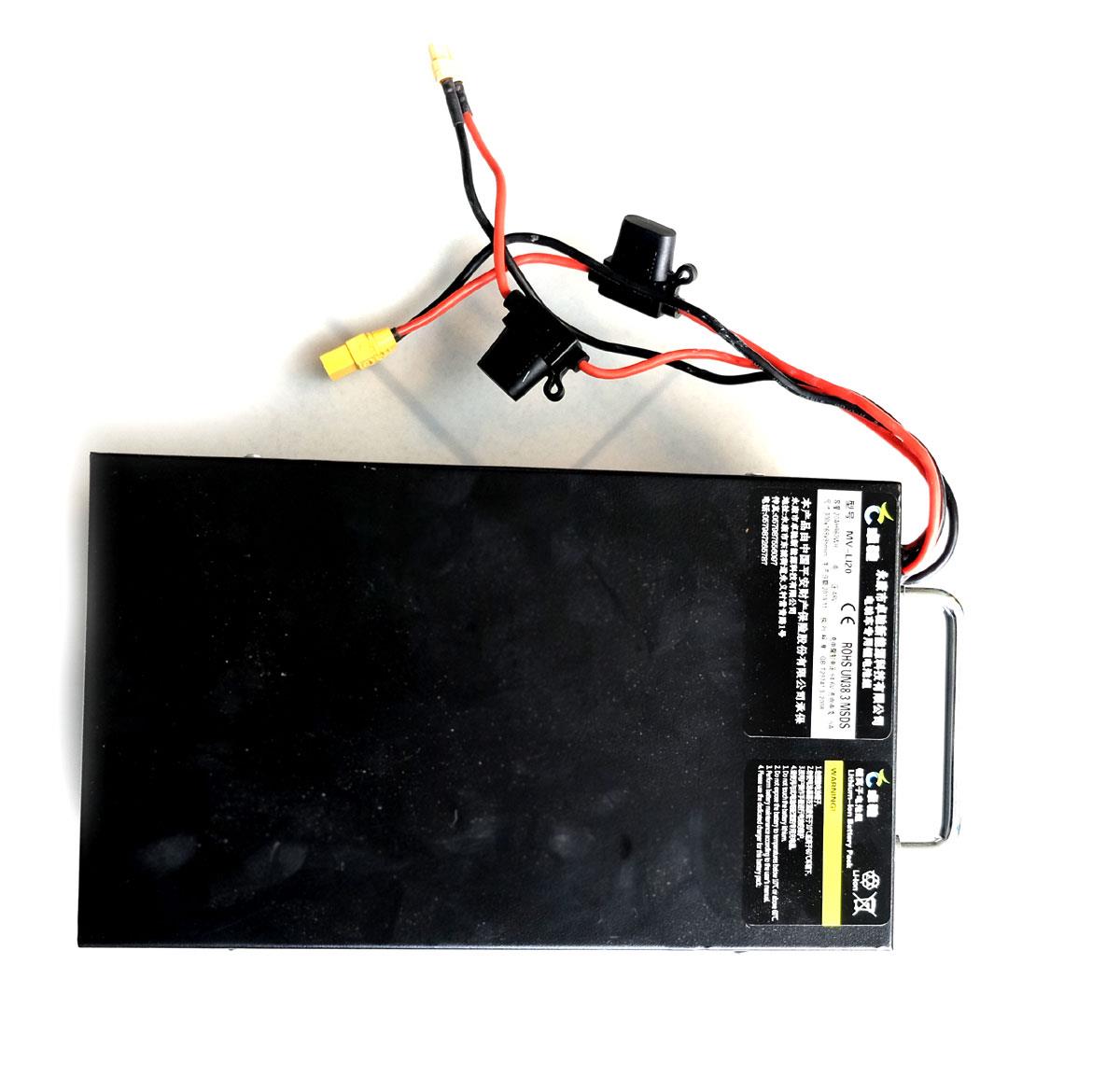 48V (54,6V) - 973 Wh ausgelesen von Nennleistung 1200Wh = 81% - 20,5Ah von 25Ah Lithiumakku für Trekstor EG90 Allradmoped 30 x 17 x 9,5 cm mit ~ 8 Kg, abklappbaren Tragegriff, 2 x 35A Sicherung.