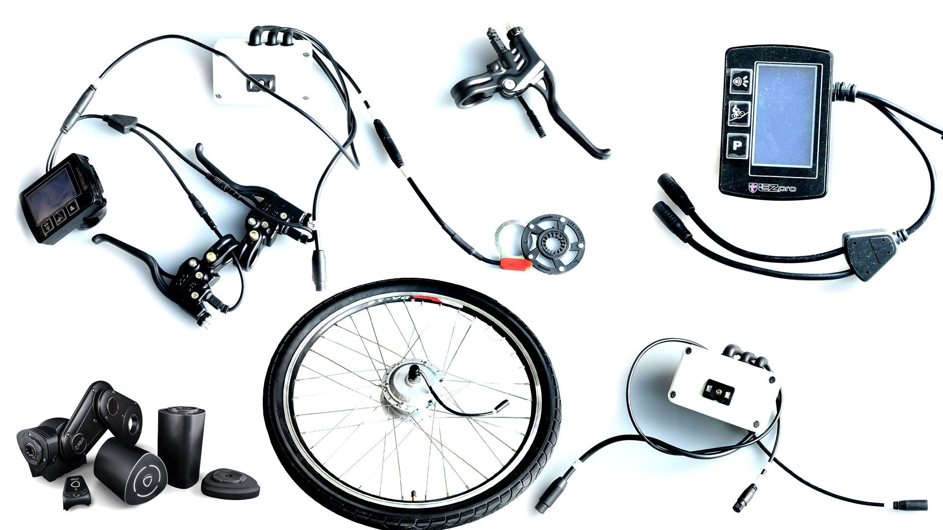 ...bestehend aus Steuereinheit, Display, Sensor, 2 x Bremshebel und Motorkabel.