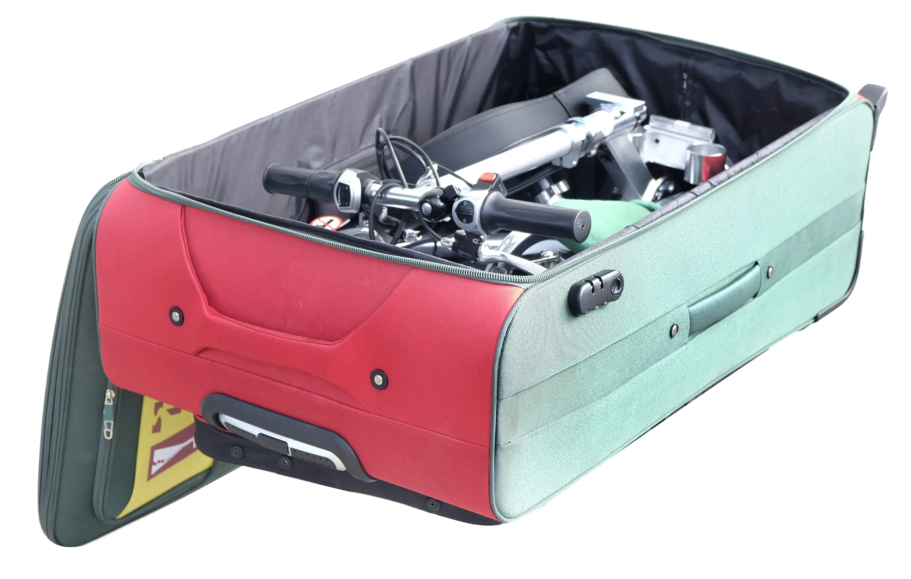 Das innovative Klapp-System des TravelScoot ™ Escape erlaubt mit einem Knopfdruck das Falten so flach, dass er in praktisch jedem Kofferraum Platz findet. Das komplette Sitz-Modul samt Halterung kann durch Öffnen einer einzigen Klemme entfernt werden. Wenn nötig, kann auch es schnell in drei Teile zerlegt werden. Auch das Vorderrad löst sich in Sekunden per Knopfdruck. Der verbleibende Rahmen wiegt weniger als 10 kg. Aber in den meisten Fällen reicht es, den Lenker tiefer zu stellen und die Rückenlehne zu entfernen, ebenfalls in nur wenigen Sekunden.