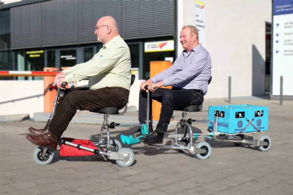 Ultraleicht! 12 Kg inklusive Akku!Durch Reduzieren der Motorkraft auf 100 Watt und durch Verkleinern der Räder auf 6“ konnten wir das ohnehin schon geringe Gewicht der TravelScoot Escape um nochmal stolze ~4 kg auf ~12 kg verringern. Die nochmals geringere Geschwindigkeit von 4 km/h ermöglicht sichere Nutzung des Elektromobils auch in belebten Fußgängerzonen und Einkaufszentren etc.. Durch die verringerte Geschwindigkeit wird auch die Reichweite des 252 Wh Akkus ausgedehnt auf gut über 20 Kilometer.Der Travelscootrahmen Shopping Cruiser jetzt mit Tiefeinstieg und äusserst kompakten Maßen von 72 x 53 x 27 cm gefaltet bei unglaublich leichten 8,x Kg Rahmengewicht (Rahmen mit Lenker, Motor, Bremsen, Hinterrädern, Lenksäule usw.) mit leistunsstarkem Nabenmotor, Rueckwaertsmodi und Bandbremse, Sitz mit Sattelrohr und Sitzplatte (1,3 Kg) mit Rückenlehne und Rückenlehnpolster (0,5 Kg) auf U-Bügel (0,4 Kg), abmontierbare Fussraster mit Gehstockköcher. Fußraster auf 13,5 cm Höhe (Fußraster nach vorne über Zubehör verlängerte Fußraster verlagerbar). Lenkerbreite 41 cm, Bodenfreiheit niedrigste Stelle 4 cm. Höhenverstellbarer Lenker. Höhenverstellbarer Sitz, Sitz mit Zubehör (U-Bügelvarianten) nach vorne und nach hinten verlagerbar für kleine und große Personen. Hier im Set mit 252 Wh Lithium Ionen Akku (1,52 Kg) und Ladegerät; Ablagedreieck & Trageasche. Gesamtgewicht ~ 12 Kg.Funktionale Unterschiede zum TravelScoot Escape:Der TravelScoot Shopping Cruiser ist nicht für Offroadexkursionen und unbefestigte weiche Untergründe & Wege oder Rasen etc. geeignet sondern bedarf eines festen Untergrundes (geteerte Wege, gepflegte befestigte Schotterwege und gepflasterte Wege sind nutzbar jedoch nicht Sandwege und unbefestigte Wildwege etc.).Die Geräuschentwicklung des doppelt untersetzten Motors ist unverbeidbar jedoch für Passanten auch ein Hinweis dass ein Fahrzeug in der Nähe ist. Um einen hohen Drehmoment bei dieser niedrigen Geschwindigkeit zu bewerkstelligen muß das Motorgetriebe speziell untersetzt werden und diese Getriebeuntersetzung erzeugt leider ein höhrbares rauschendes Getriebegeräusch.Fazit: Wenn das Gewicht priorisiert wird ist diese Mobilitätshilfe einzigartig und ermötlicht es den Nutzern i.d.R. den Scooter einfach über Hindernisse zu heben sowie bei mehrfach täglichem Ein- und Ausladen in bzw. aus dem Auto eine unbeschwerte Handhabung.