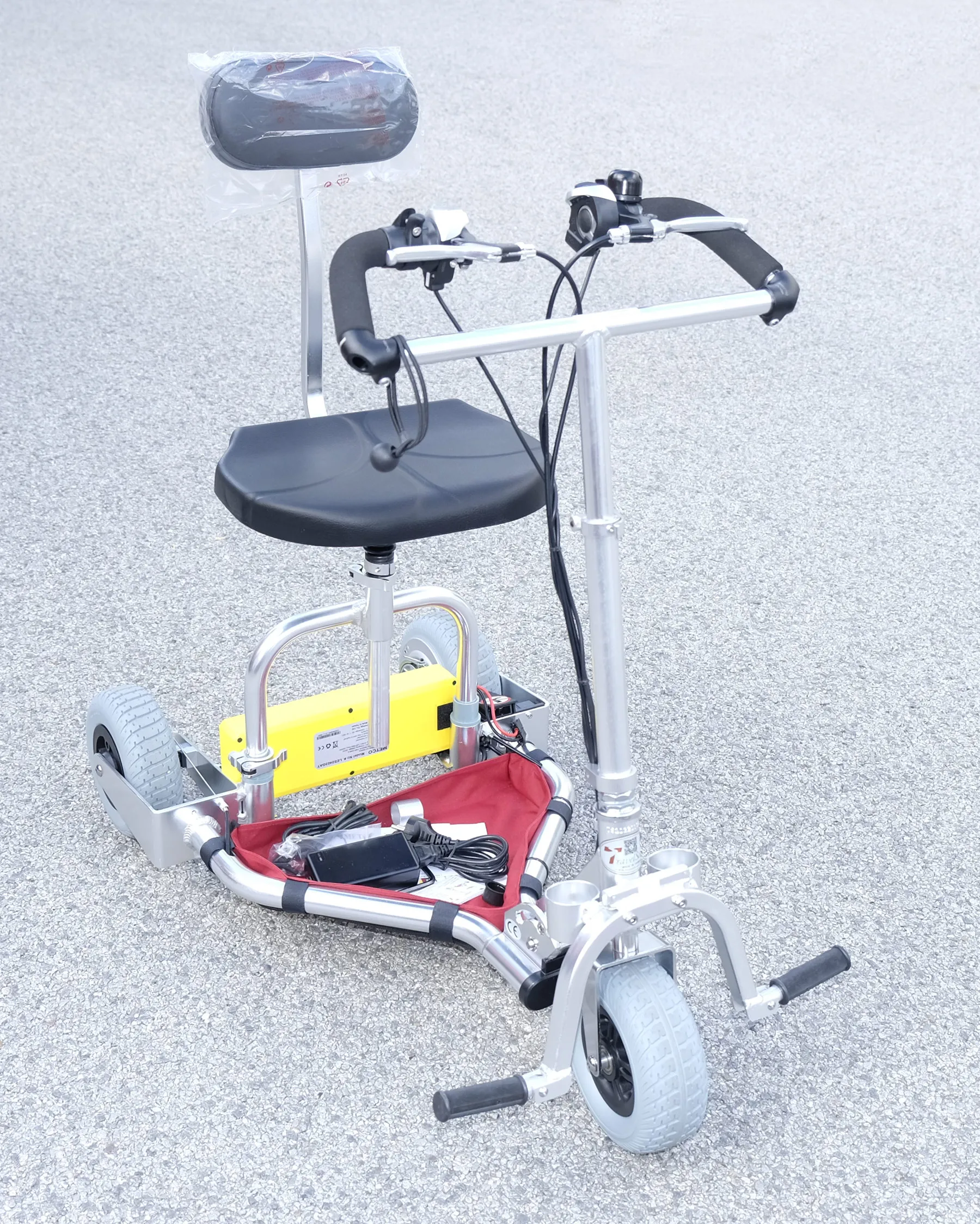 Der TravelScoot Escape ist der ideale Reisebegleiter; zu jeder Zeit und an jedem Ort einsatzbereit.Dort, wo extreme Wendigkeit, Ultraleichtgewicht, Robustheit und platzsparende Fortbewegung gefragt sind spielt das dreirädrige E-Mobil seine Stärken aus.Der gesamte TravelScoot Escape wiegt mit Akku nur ~ 14,8 Kg; trägt 155 Kg und lässt sich einfach ohne Werkzeug falten.Aufgrund des extrem geringen Gewichts und der schnellen und unkomplizierten Faltbarkeit verbunden mit wenig Stauraumbedarf bei hochwertigsten Materialen ist der TravelScoot seit der Markteinführung 2004 sicherlich die beliebteste Ultraleichtmobilitätshilfe am Markt.Der neueTravelScoot Escape hat Tiefeinstieg mit äußerst kompakten Maßen von 72 x 54 x 27 cm gefaltet mit extrem leichten 9,4 Kg Rahmengewicht (Rahmen mit Lenker, Motor, Bremsen, Hinterrädern, Lenksäule usw.) und leistungsstarkem Nabenmotor (24V DC 200W), Rückwaertsmodi und Bandbremse, Vorderrad breit mit Steckgabel (1,2 Kg), Sitz mit Sattelrohr und Sitzplatte (1,3 Kg) mit Rückenlehne und Rückenlehnpolster (0,5 Kg) auf U-Bügel (0,4 Kg), demontierbare Fußraster mit Gehstockköcher. Fußraster auf 13,5 cm Höhe (Fußraster nach vorne über Zubehör verlängerte Fußrastermontageblock verlängerbar). Lenkerbreite 41 cm, Bodenfreiheit niedrigste Stelle 6 cm. Höhenverstellbarer Lenker. Höhenverstellbarer Sitz, Sitz mit Zubehör (U-Bügelvariante Wendebügel als optionales Zubehör) nach vorne und nach hinten verlagerbar für kleine und große Personen.Sitzhöhe 47 - 55 cm.Steigungen bis 15 % bei 110 Kg Zuladung.Rahmen aus Flugzeugaluminium.Stockhalter mit Zurrgummi für Gehstöcke und Krücken inklusive.Reifen aus Polyurethan, pannensicher und langlebig.Im Set mit verschiedenen Akkus verfügbar - ob 20, 30 oder gar 50 Kilometer pro Ladung wählbar. Ladegerät (weltweit einsetzbar 110 - 240V), Ablagedreieck, kleines Werkzeugset, Höhenverstelldistanzringe, gedruckte Anleitung und Tragetasche. Gesamtgewicht ~14,8 Kg.
