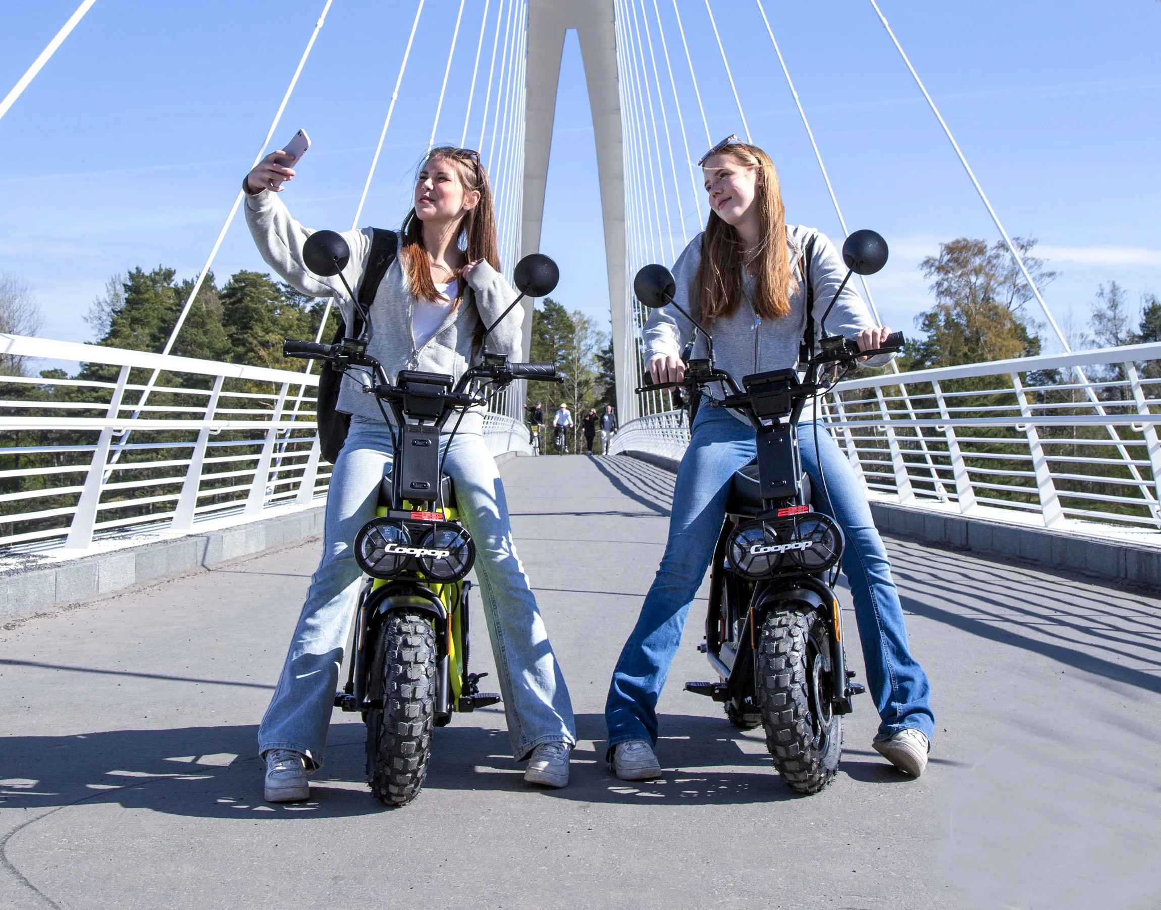 The Coopop Cityscrambler Off-Road is a real eye-catcher and immediately stays in everyone's memory; especially the test riders; ...they can't get enough of it (-:Key data:Motor 1200-2000W for 45 km/h max speedBattery 48V 26 Ah LG battery system for up to 50 kilometresBattery weight ~ 5.5 kg - quick-change - lockableTyres - City Scrambler off-road studded tyresAluminium frameBOSCH rear motorKeyless go - remote control and mechanical keyHydraulic disc brakesSteering wheel lockLED lighting with stone guardLED mini indicatorsLCD display2 rear view mirrorsWeight 34 kg without batteryDimensions: ~ 138 x 64.3 x 106 cmLoad max. 120 kgDelivery equipment: 2 mechanical keys - 2 digital keys - 1 battery pack and 1 charger as well as registration papers.