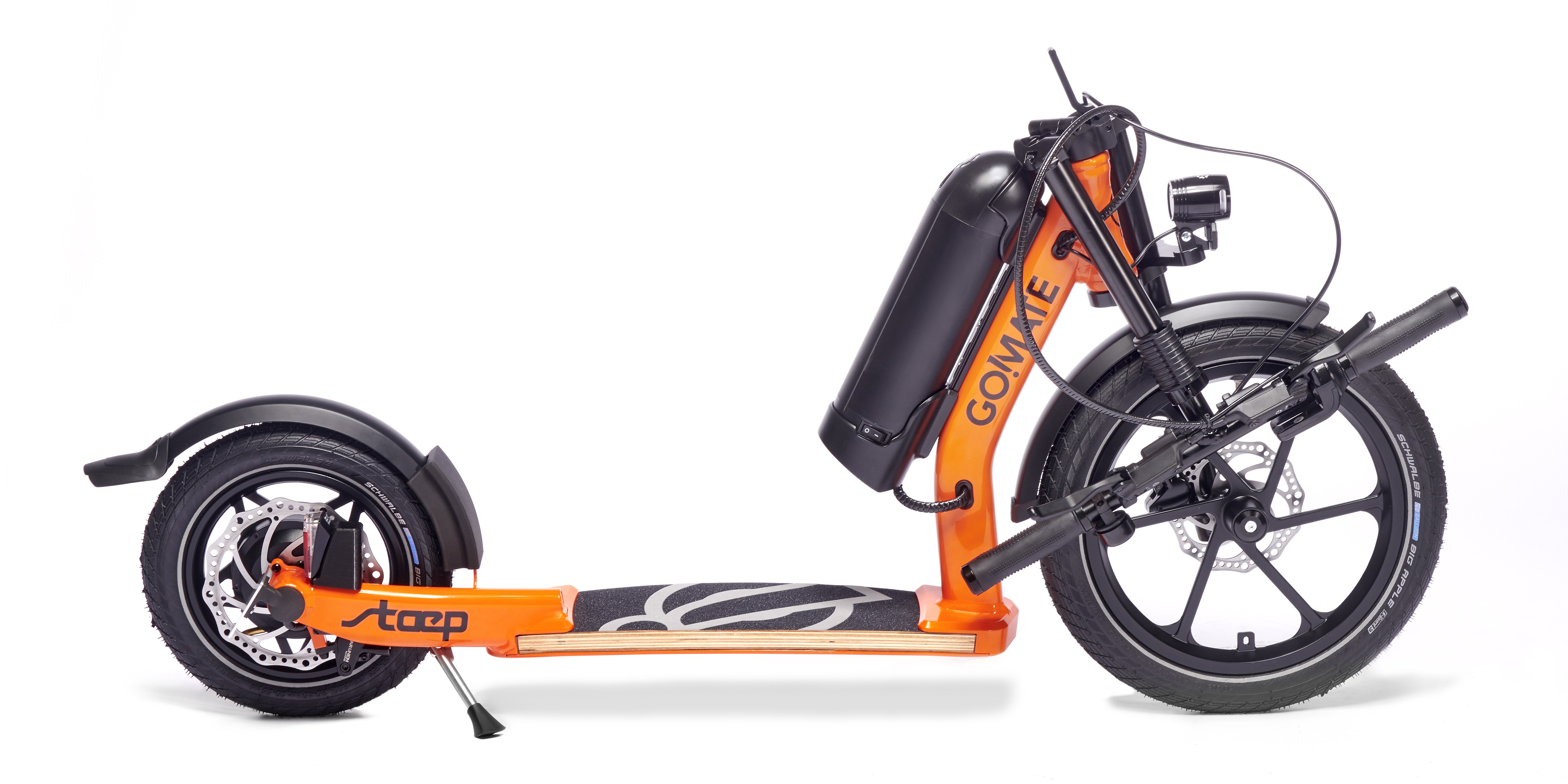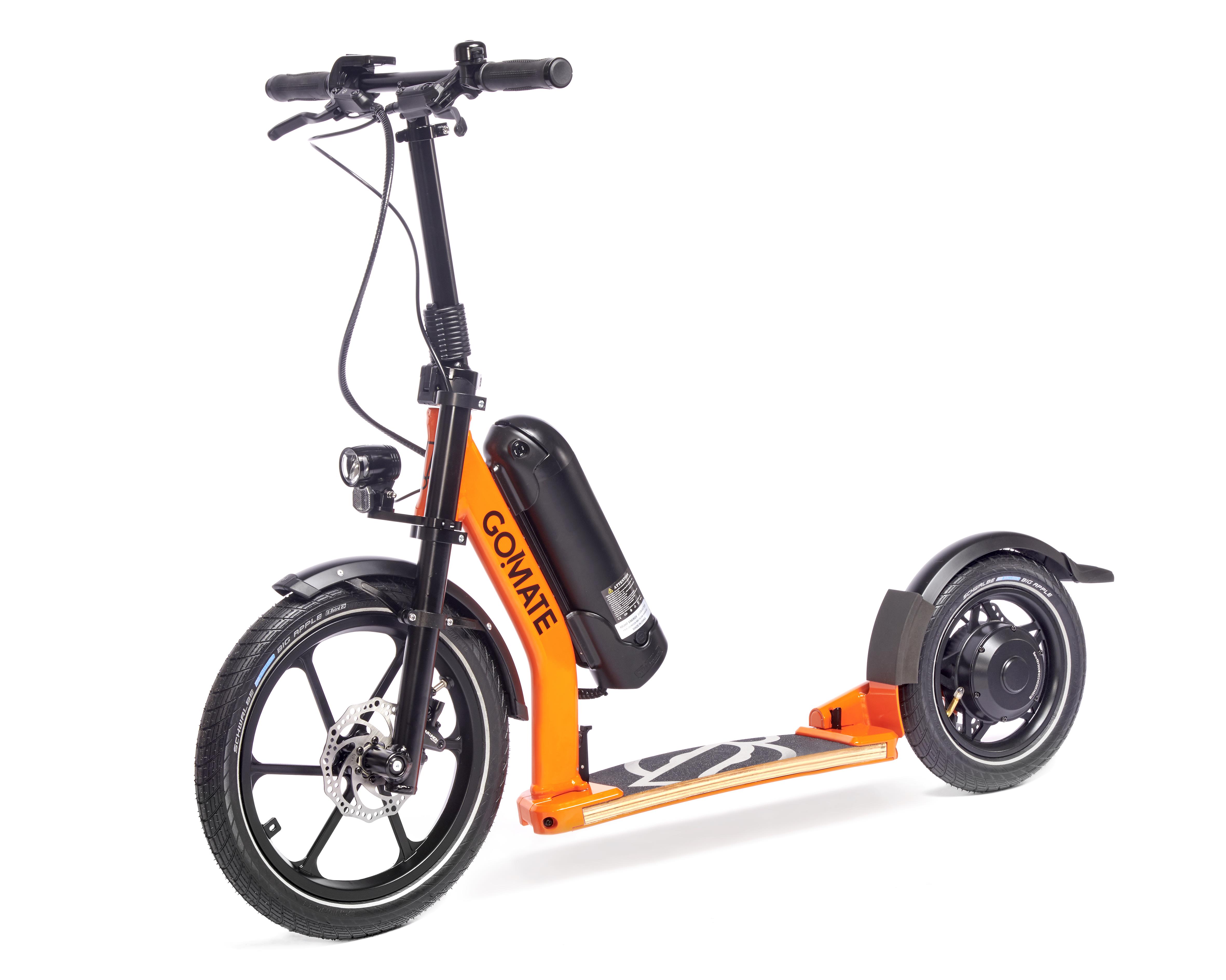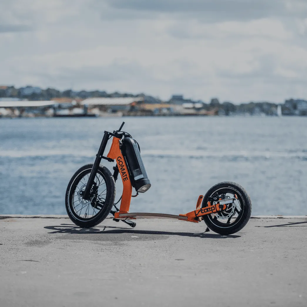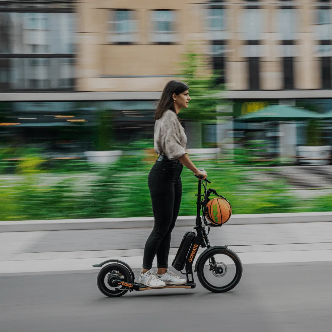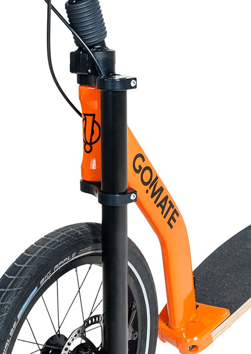Streetsurfer based on the TR1 sports scooter with multi-layered footboard, single-sided fork with 16" front wheel, a V-fork at the rear with 350W electric motor in the 12" rear wheel. The outstanding suspension results from the combination of footboard and pneumatic tyres and provides the incomparable go!mate riding experience. The handlebars can be folded down for transport. The scooter has a disc brake system and is completely Made in Germany - a noble scooter of quality.