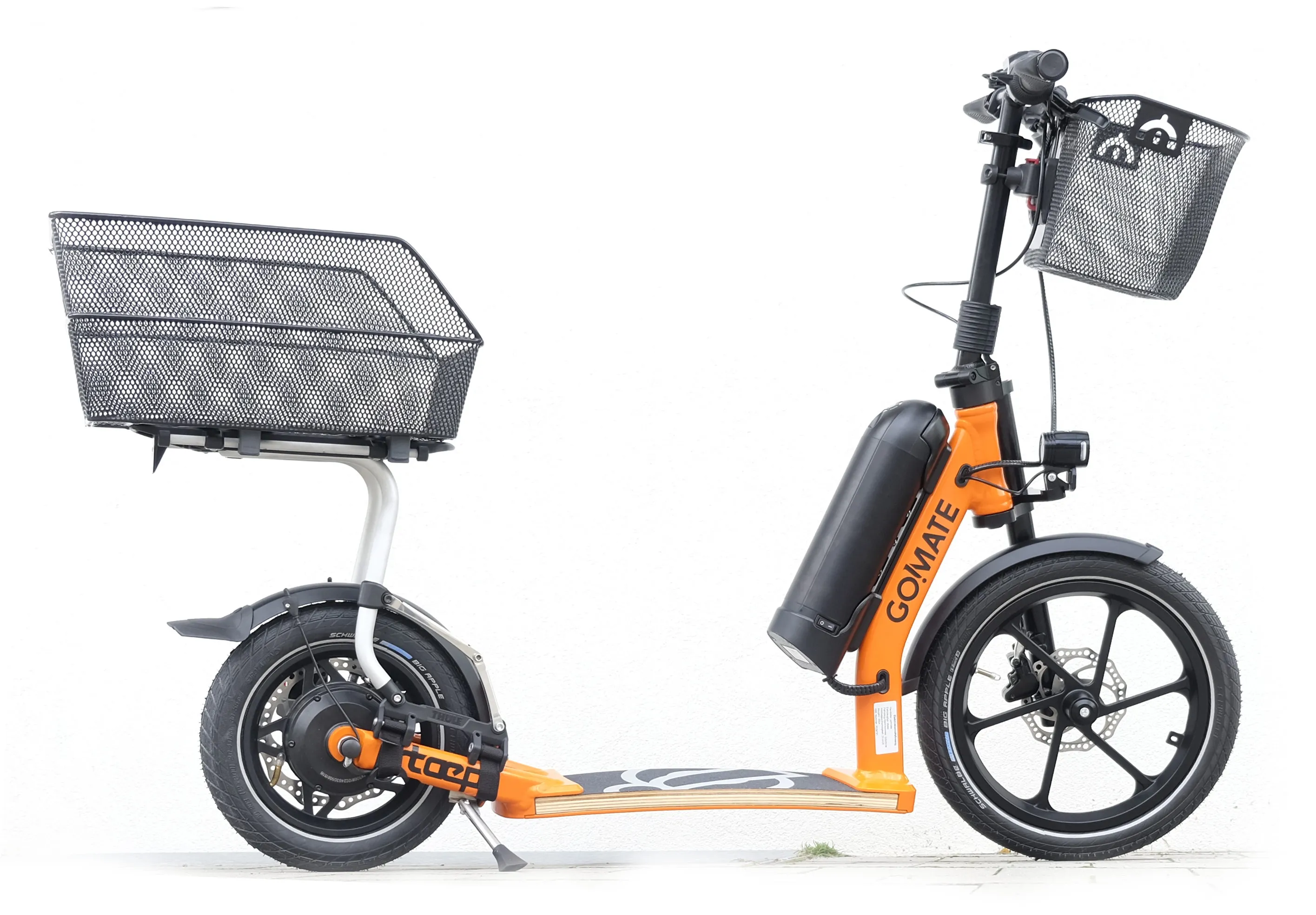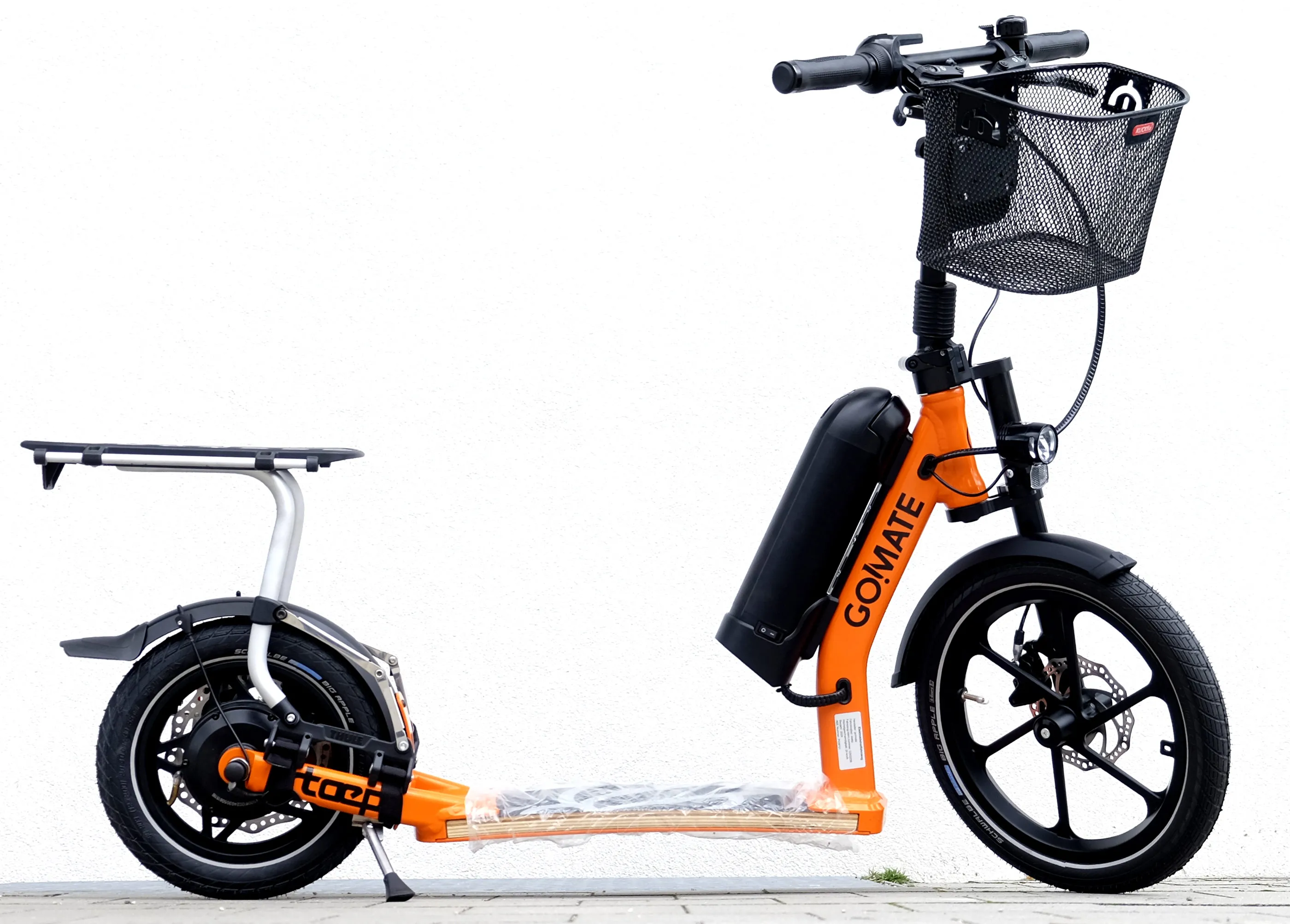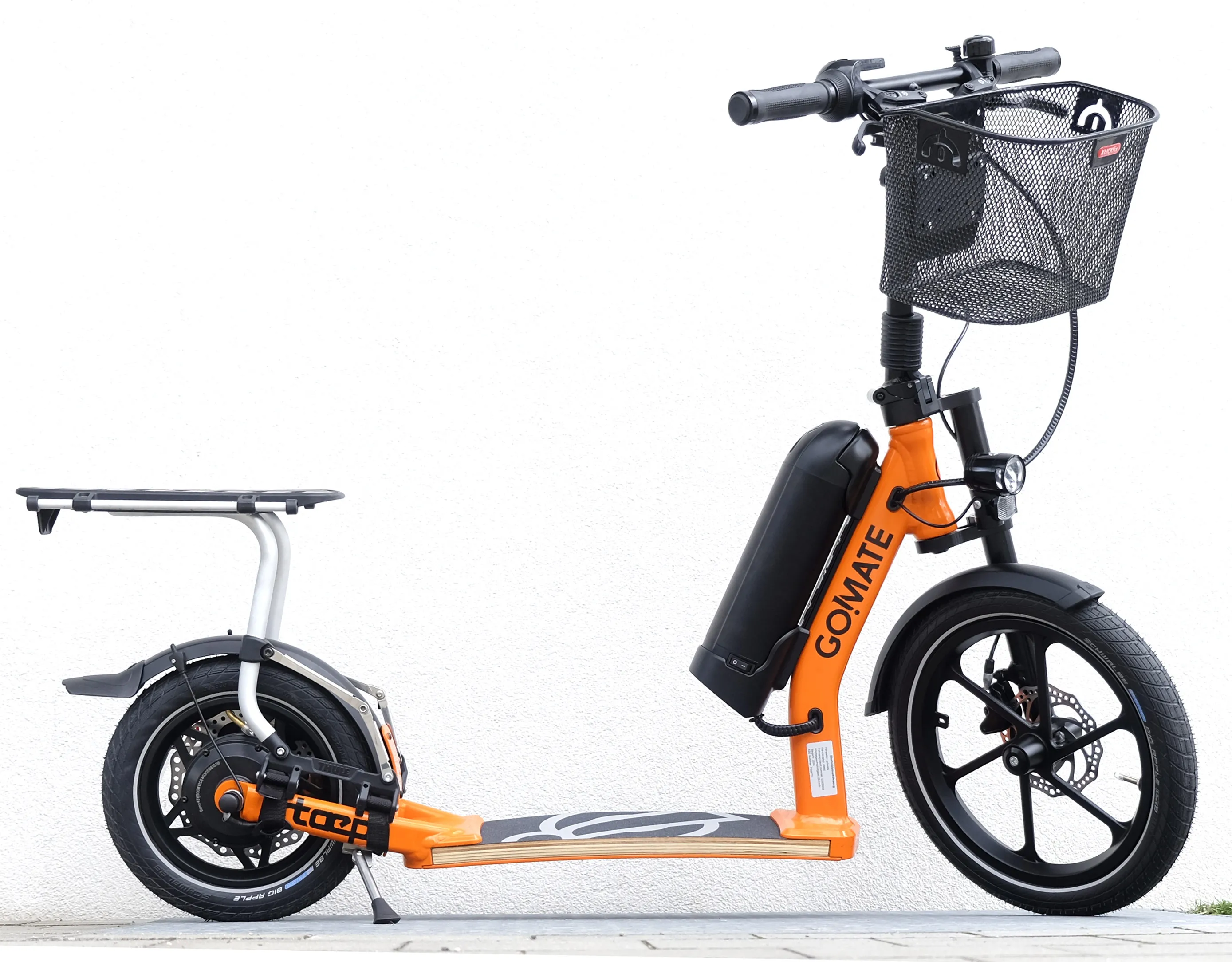 Streetsurfer based on the TR1 sports scooter with multi-layered footboard, single-sided fork with 16" front wheel, a V-fork at the rear with 350W electric motor in the 12" rear wheel. The outstanding suspension results from the combination of footboard and pneumatic tyres and provides the incomparable go!mate riding experience. The handlebars can be folded down for transport. The scooter has a disc brake system and is completely Made in Germany - a noble scooter of quality.