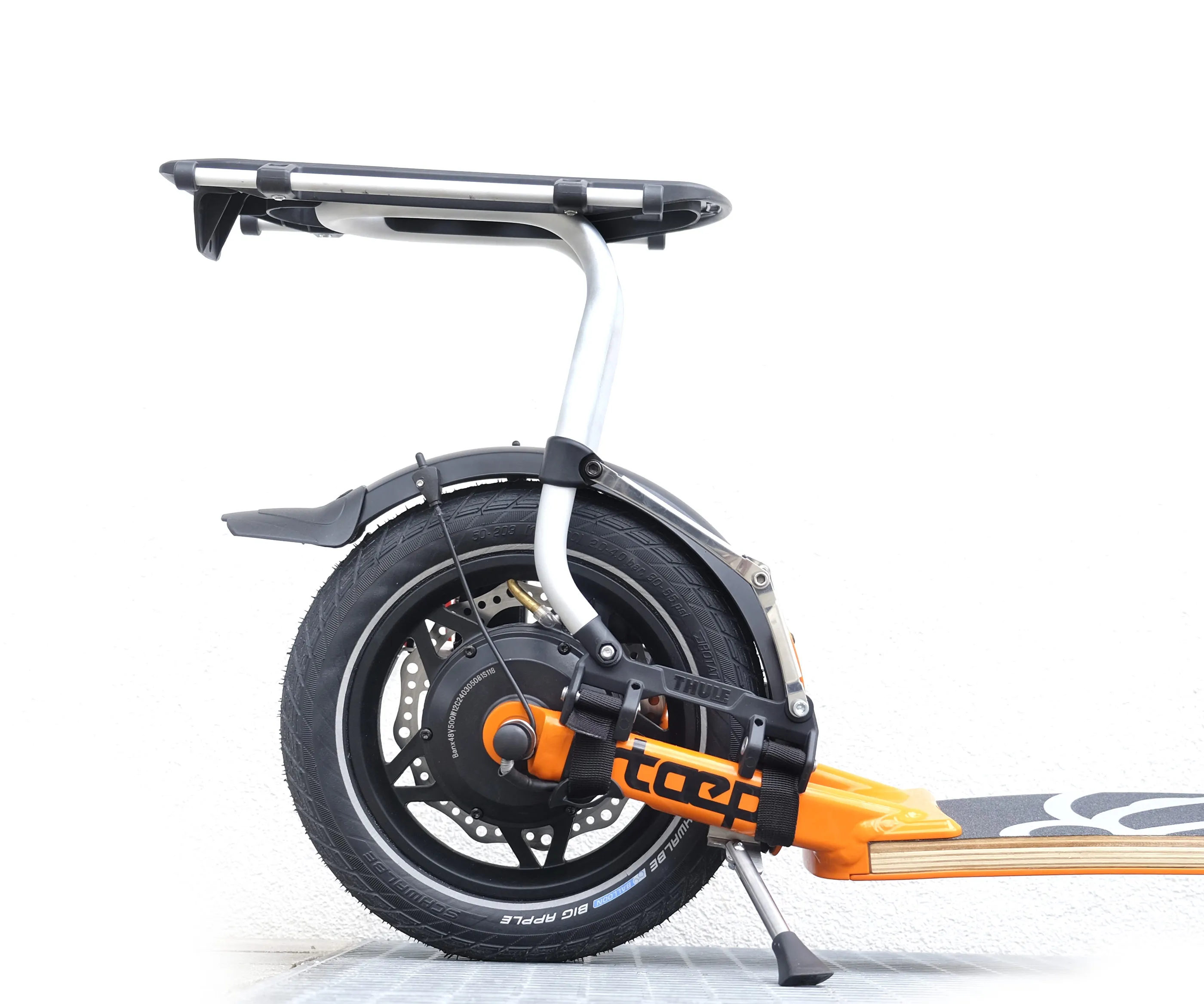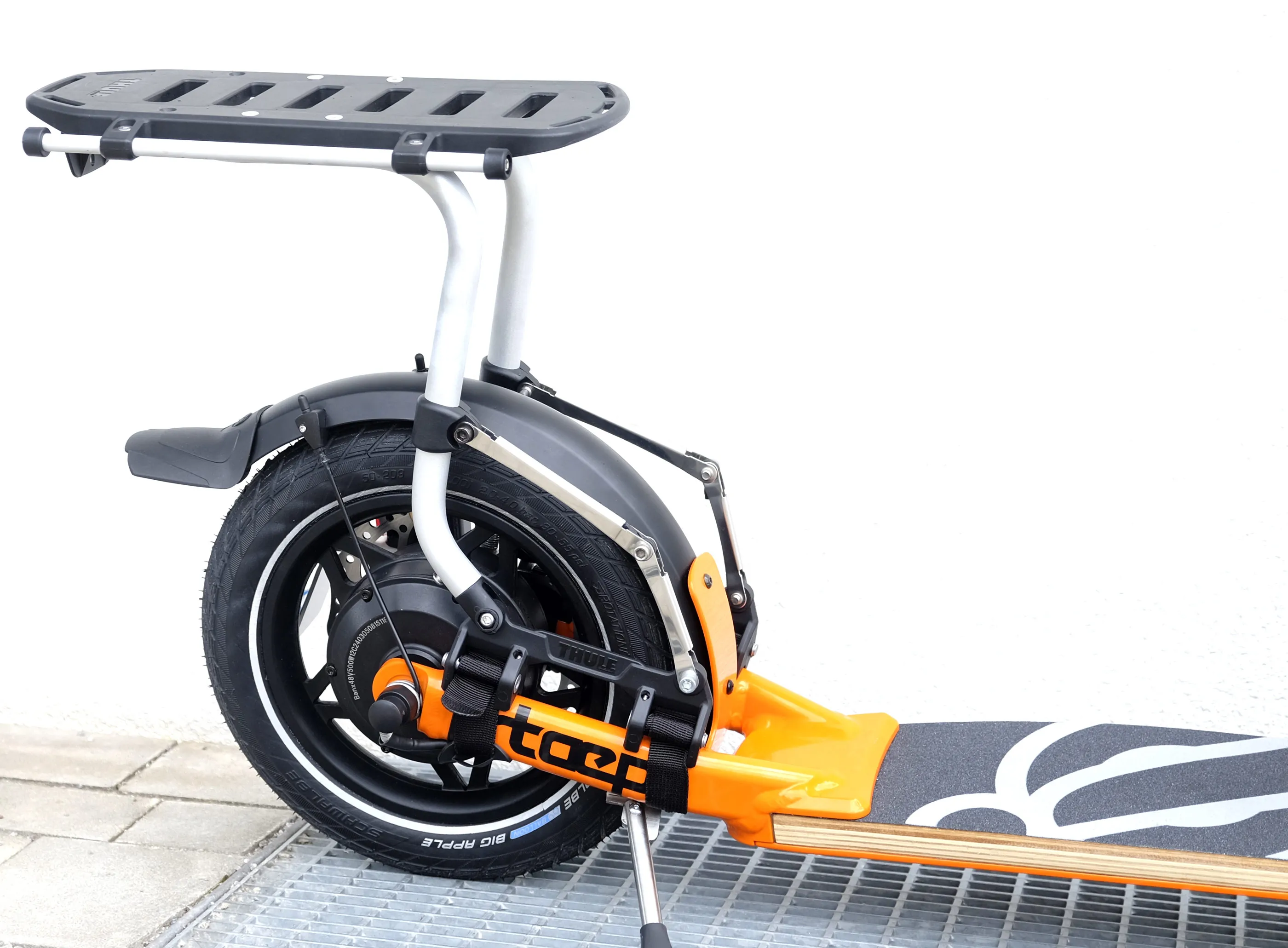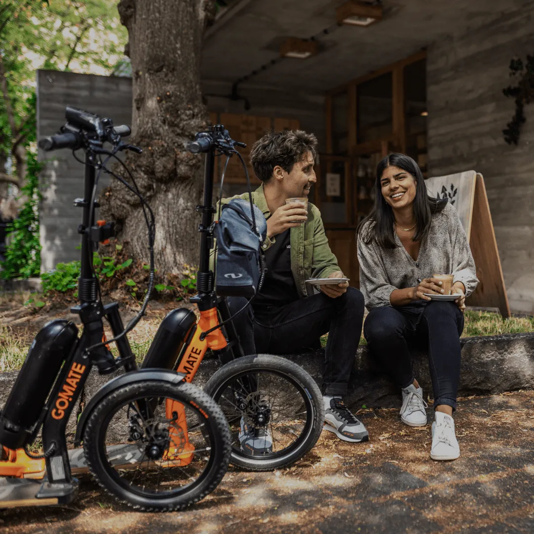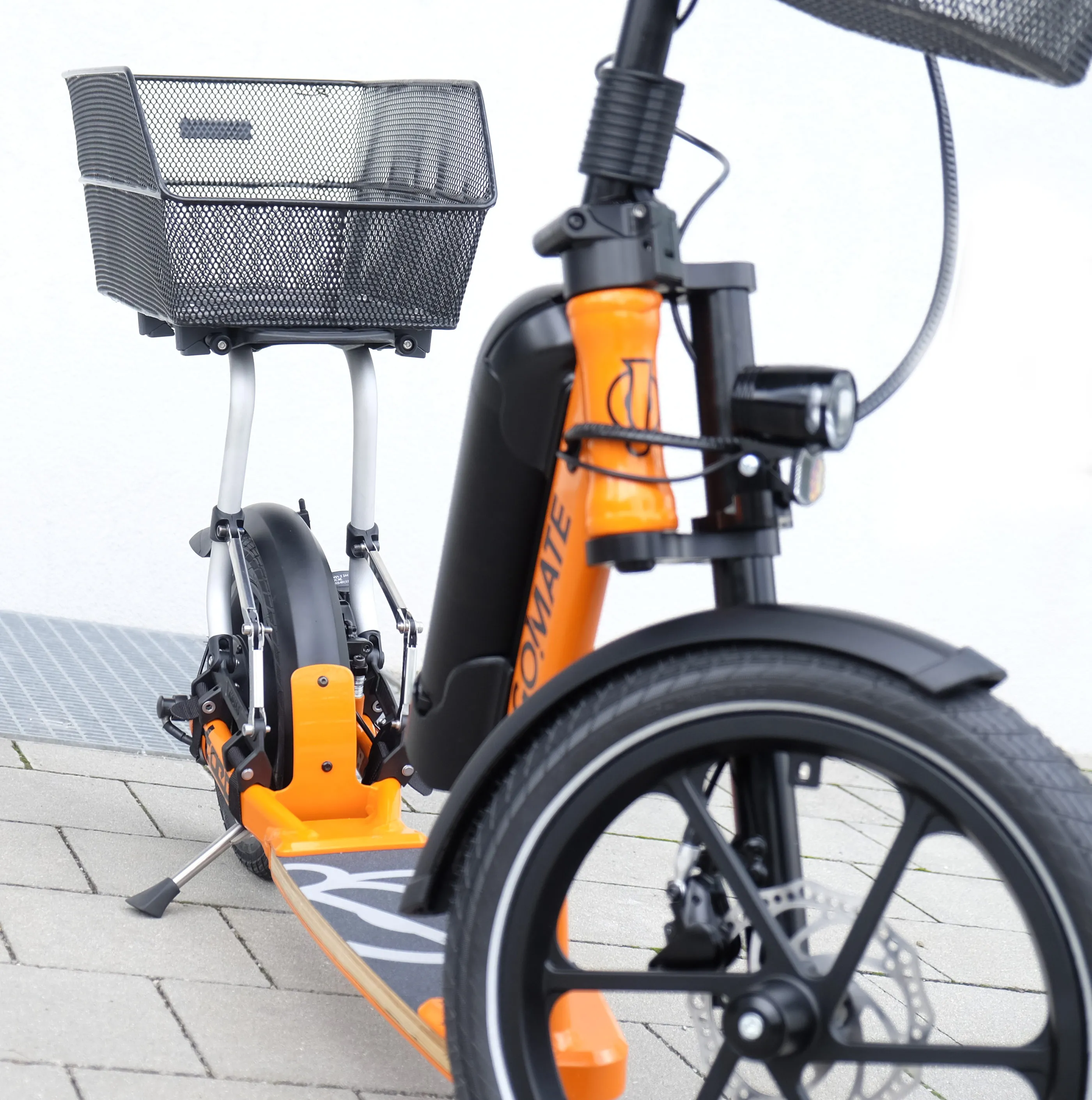 Streetsurfer based on the TR1 sports scooter with multi-layered footboard, single-sided fork with 16" front wheel, a V-fork at the rear with 350W electric motor in the 12" rear wheel. The outstanding suspension results from the combination of footboard and pneumatic tyres and provides the incomparable go!mate riding experience. The handlebars can be folded down for transport. The scooter has a disc brake system and is completely Made in Germany - a noble scooter of quality.
