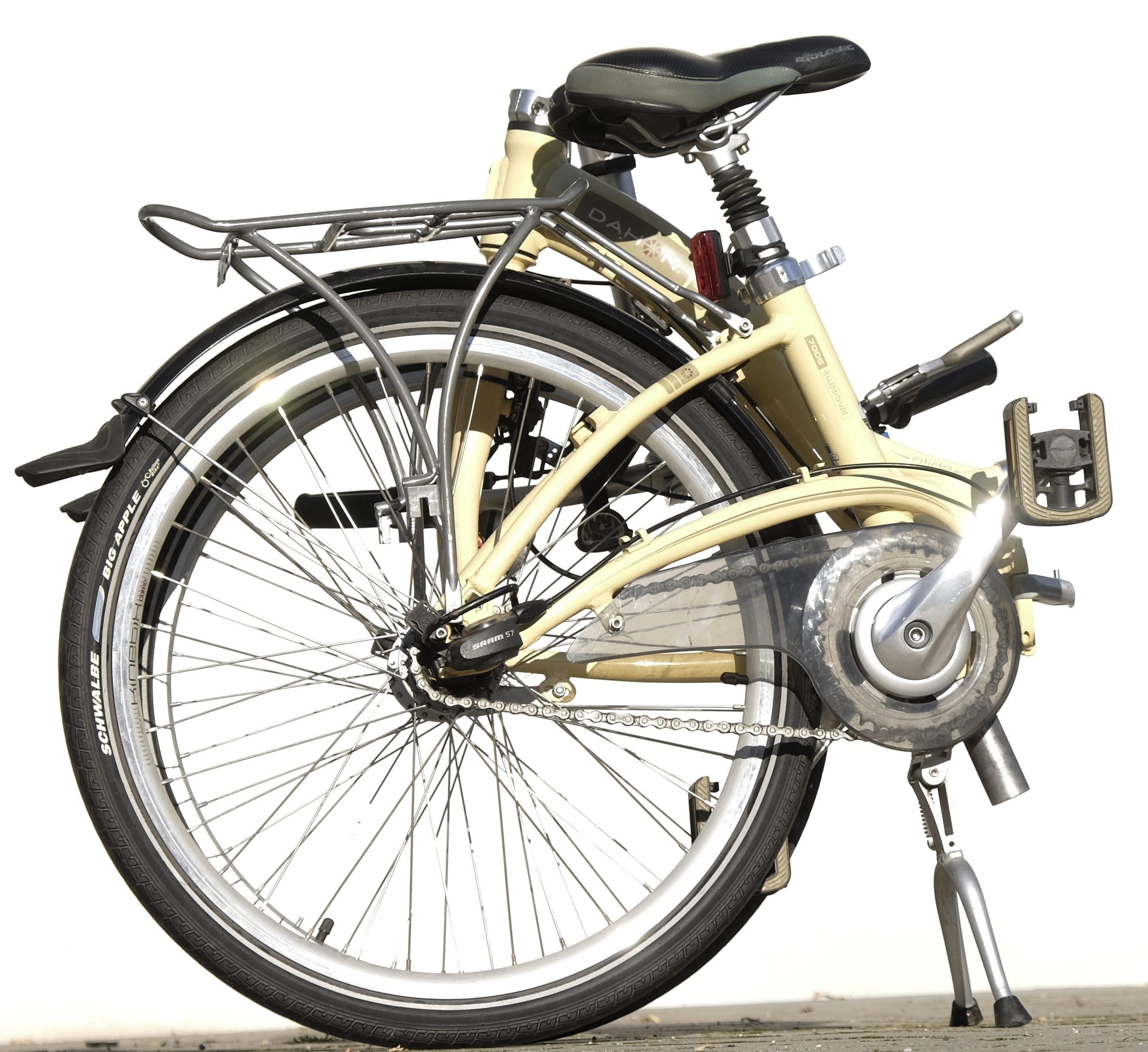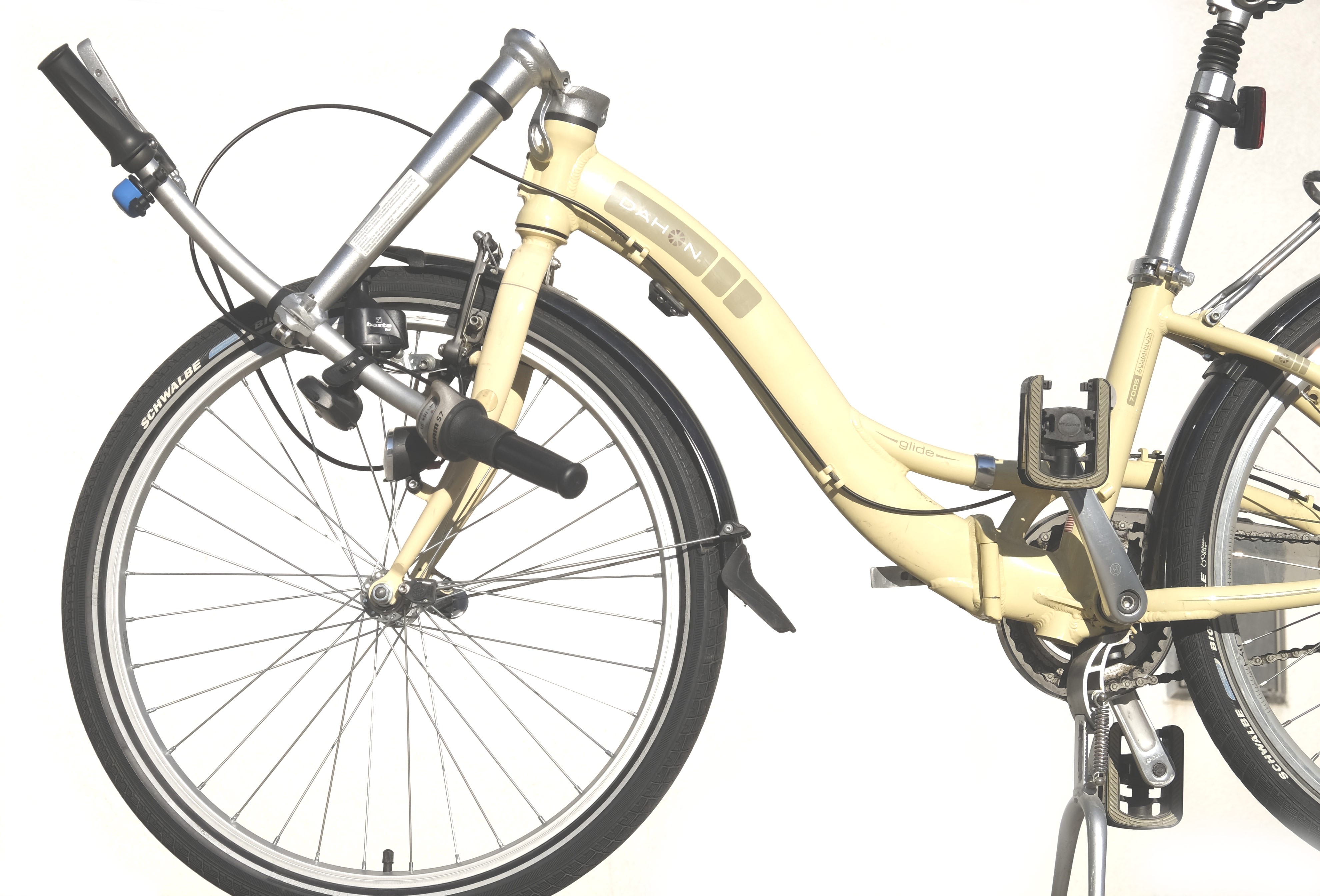 Faltbares 24 Zoll Bike mit Schwalbe Big Apple Bereifung, Zweibeinständer, Sattelfederung, 7-Gang Nabenschaltung, Gepäckträger, Klapppedale, LED Licht via Seitendynamo.