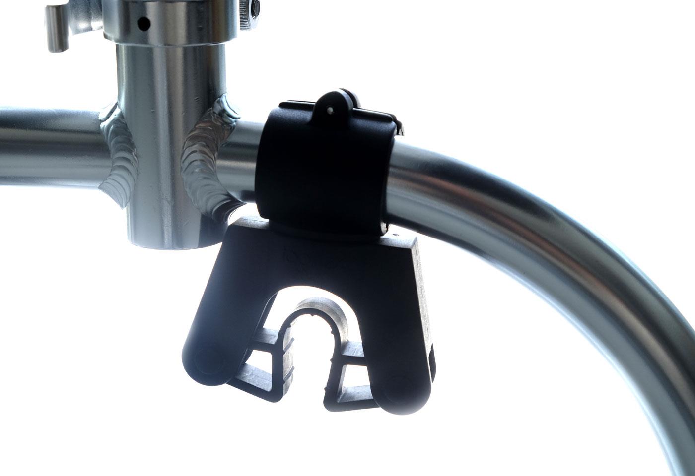 Opción de montaje adicional - aplicable universalmente en el U-bow o en el respaldo etc. - aquí con abrazadera fijada de forma segura al tubo de 22-25 mm, incluyendo 2 tornillos M5x20.